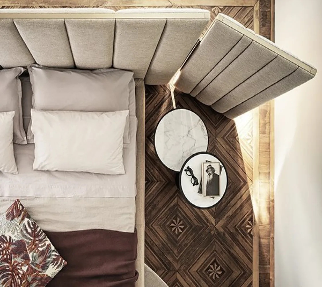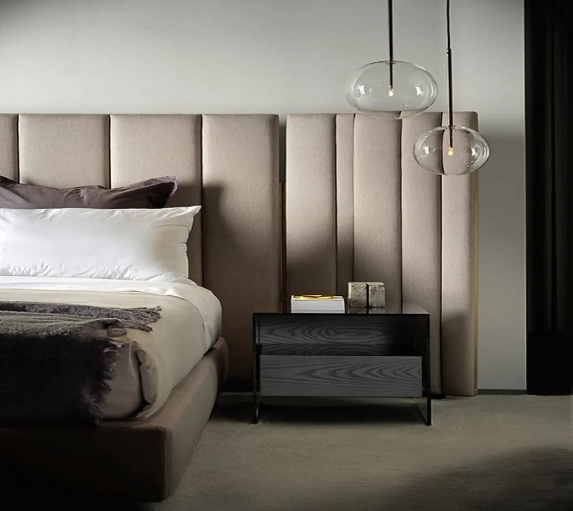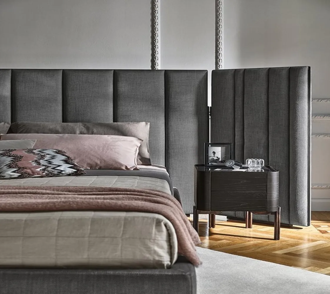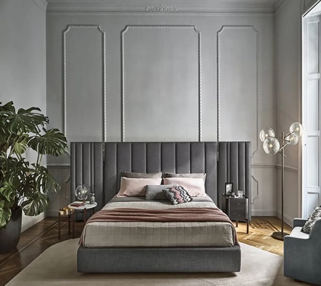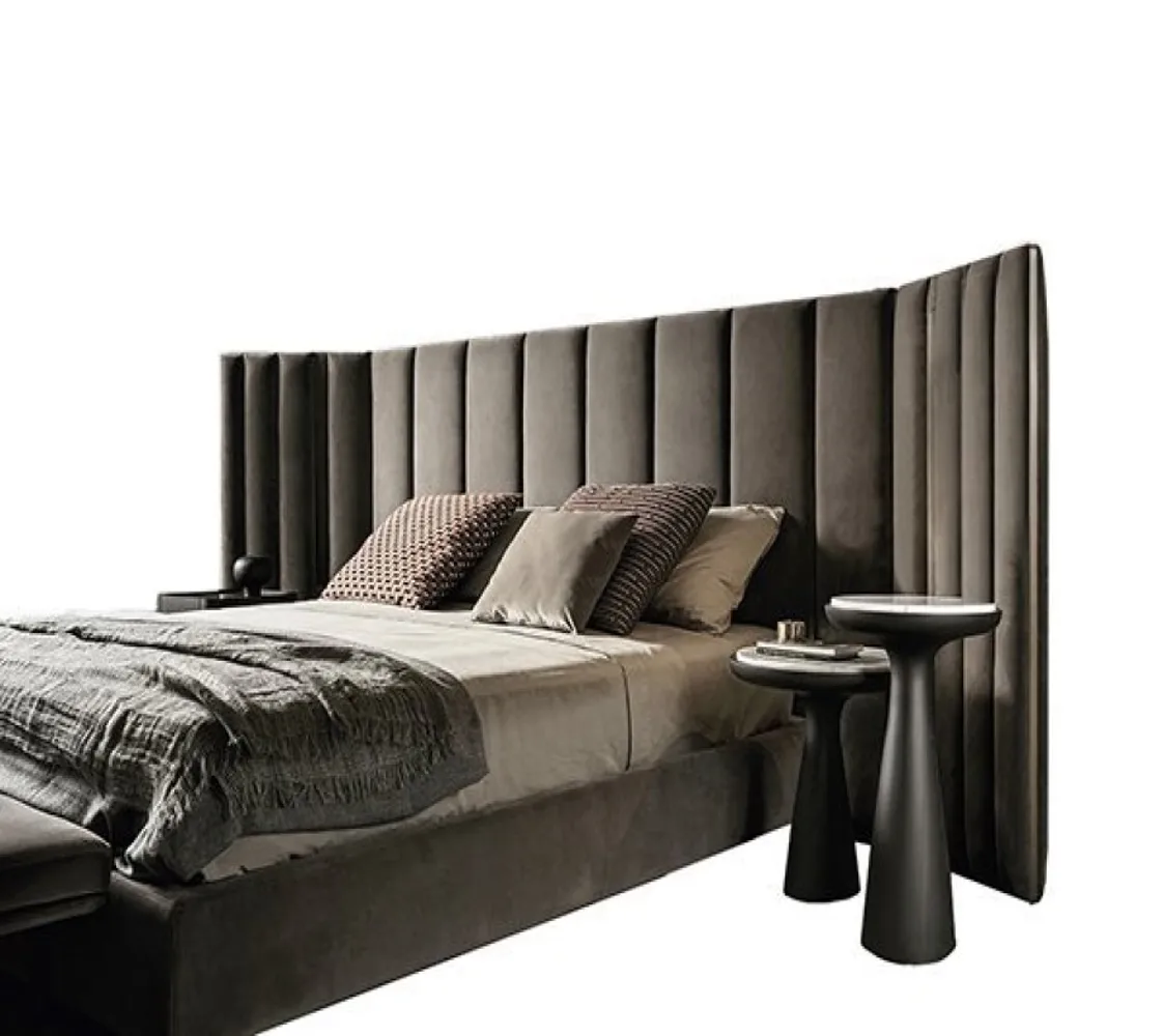 سرير من إسفنج وقماش كتان بكثافة مختلفة وألياف البوليستر. لوح أمامي منجد قائم بذاته مع ألواح جانبية قابلة للتعديل. شرائح خشبية متضمنة. متوفر مغطى بالقماش أو الجلد حسب العينات. تفاصيل من النحاس الساتان أو النحاس المطلي باللون الأسود غير الشفاف. منفذ شاحن USB (واحد لكل جانب) عند الطلب. يلزم خياطة إضافية للعناصر ذات التنجيد الجلدي مقارنة بالعناصر ذات التنجيد القماشي.