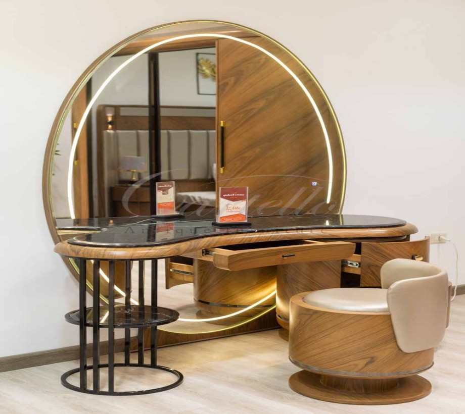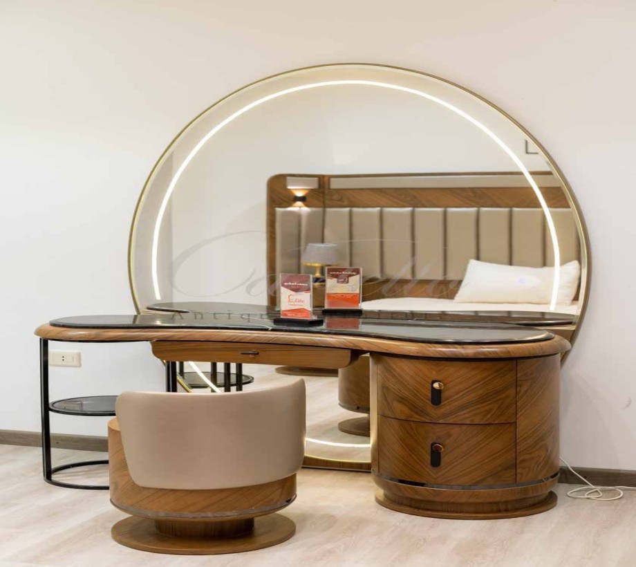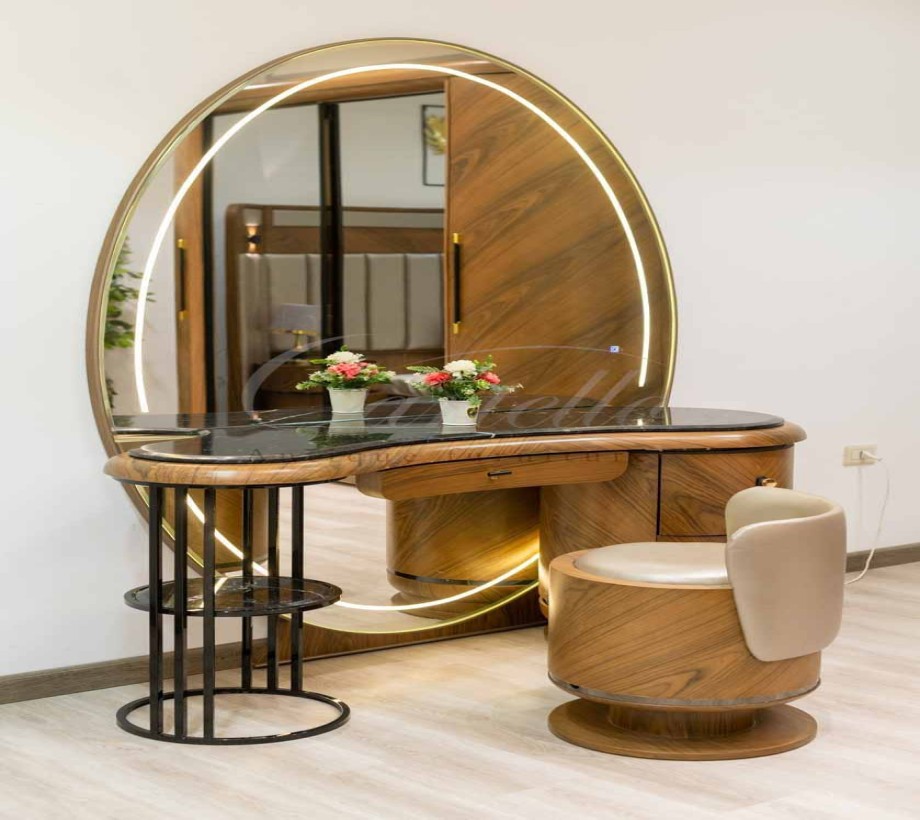 طاولة مكياج عصرية بدرج مع مكان تخزين لغرفة النوم باللون الخشبى ومرآة قائمة تسريحة بتصميم عصري مميز مع بف باللون البيج، مصنوعة من خشب طبيعي، تضفي لمسة من الأناقة والفخامة على غرفة النوم، .