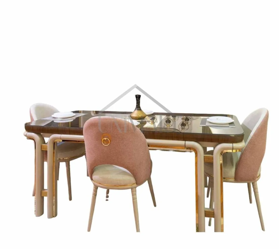 طاولة طعام + 6 كرسى طاولة خشبية بتصميم عصري ، كرسي مريح بلون البيج مع وردى فاتح. مصنوعة من خامات ذات جودة عالية مثل الخشب الطبيعي وخشب الزان