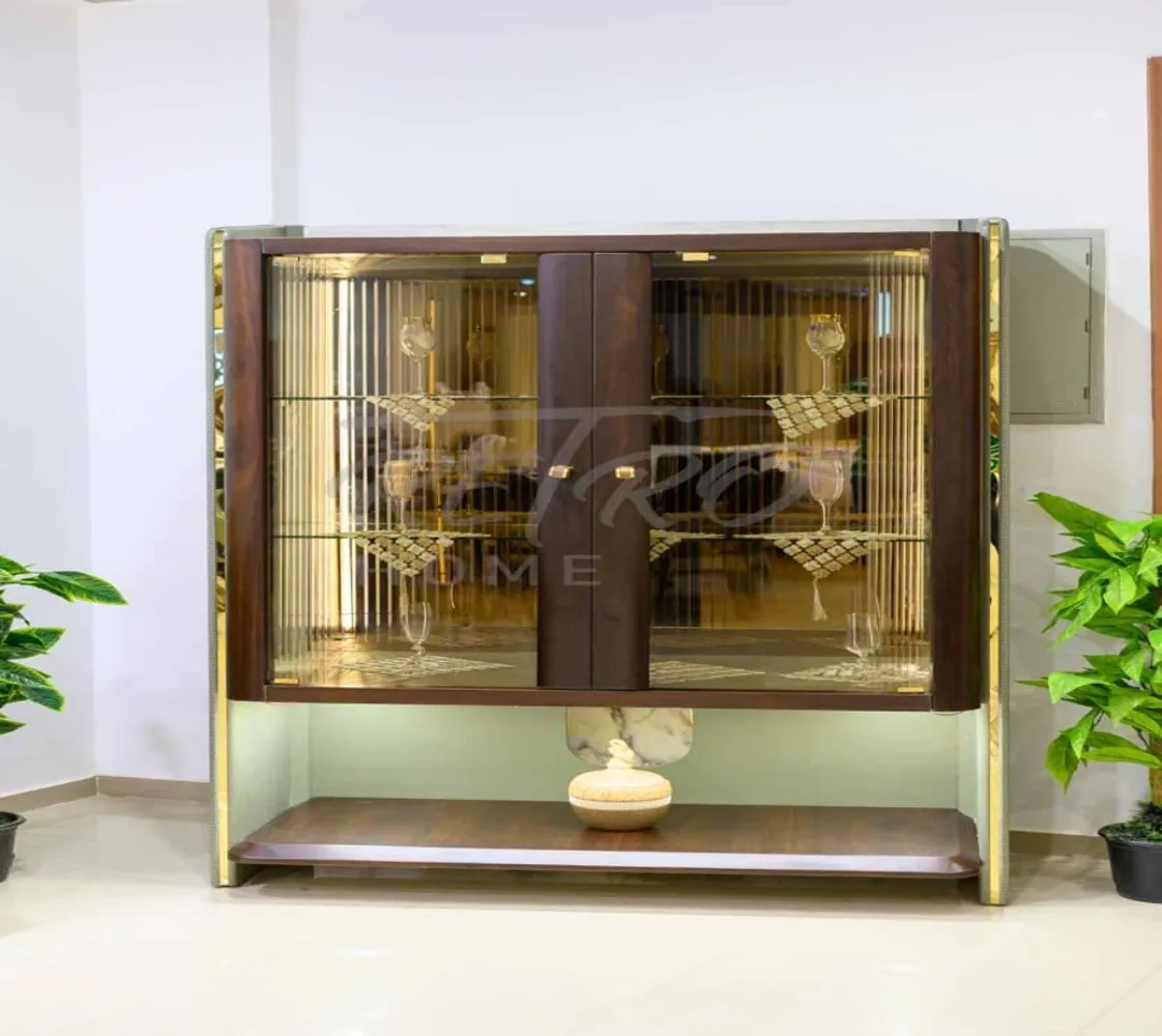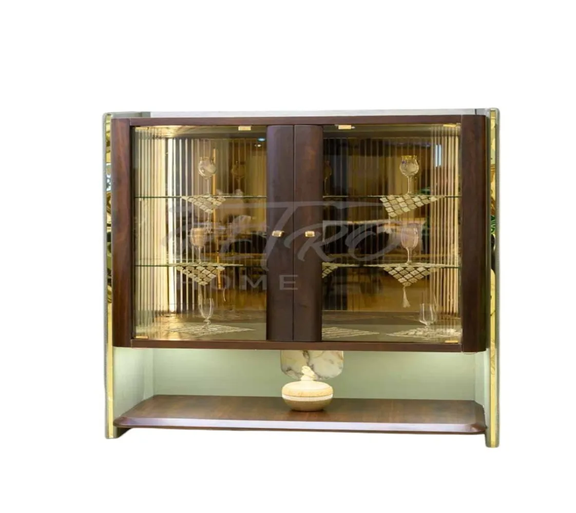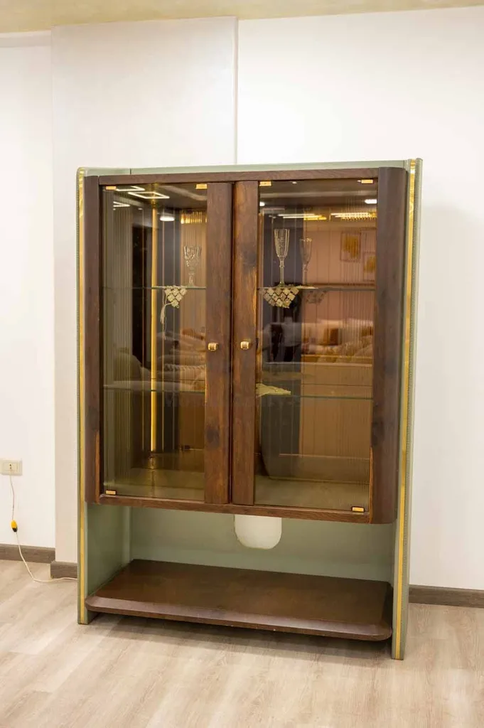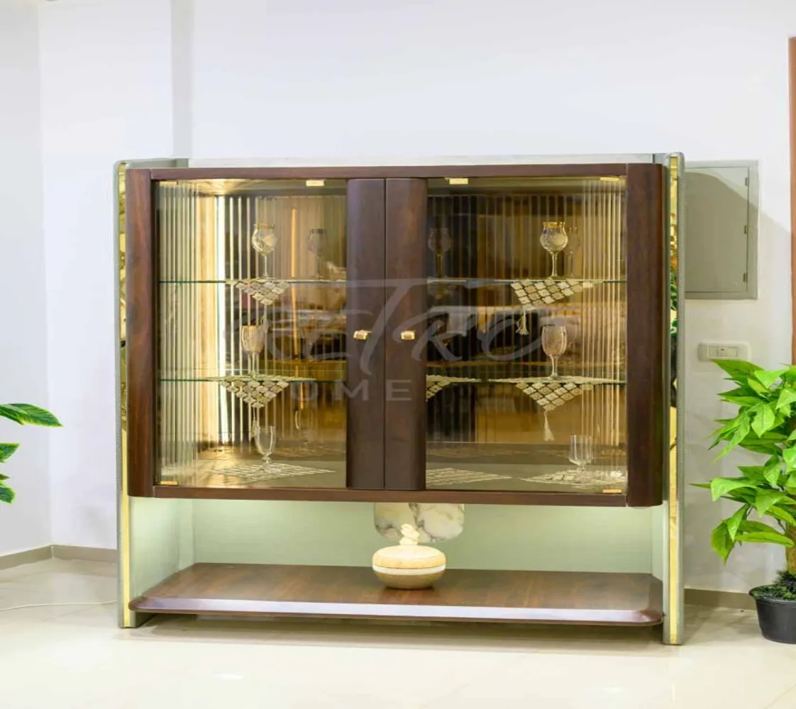 تحتوي هذه الخزانة الخشبية على بابين زجاج شفاف بمفصلة مع حافة خشبية. يوجد ثلاثة أرفف زجاجية. يمكن تضمين نظام إضاءة شريطية LED اختياري لتعزيز خزانة العرض.