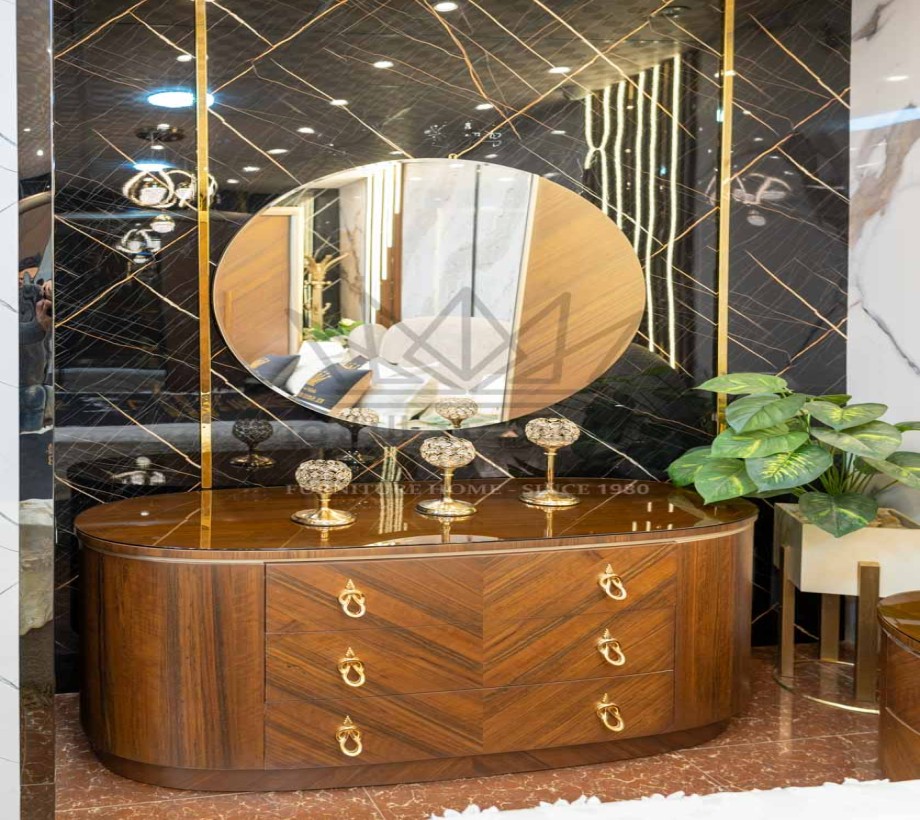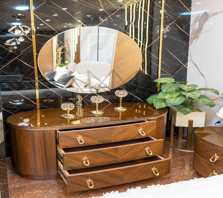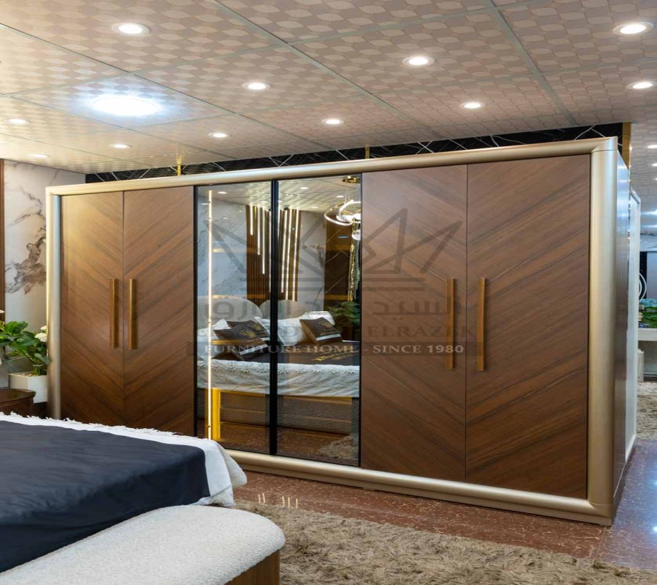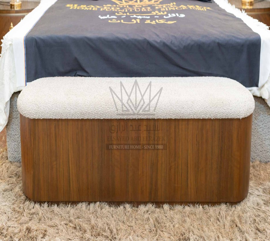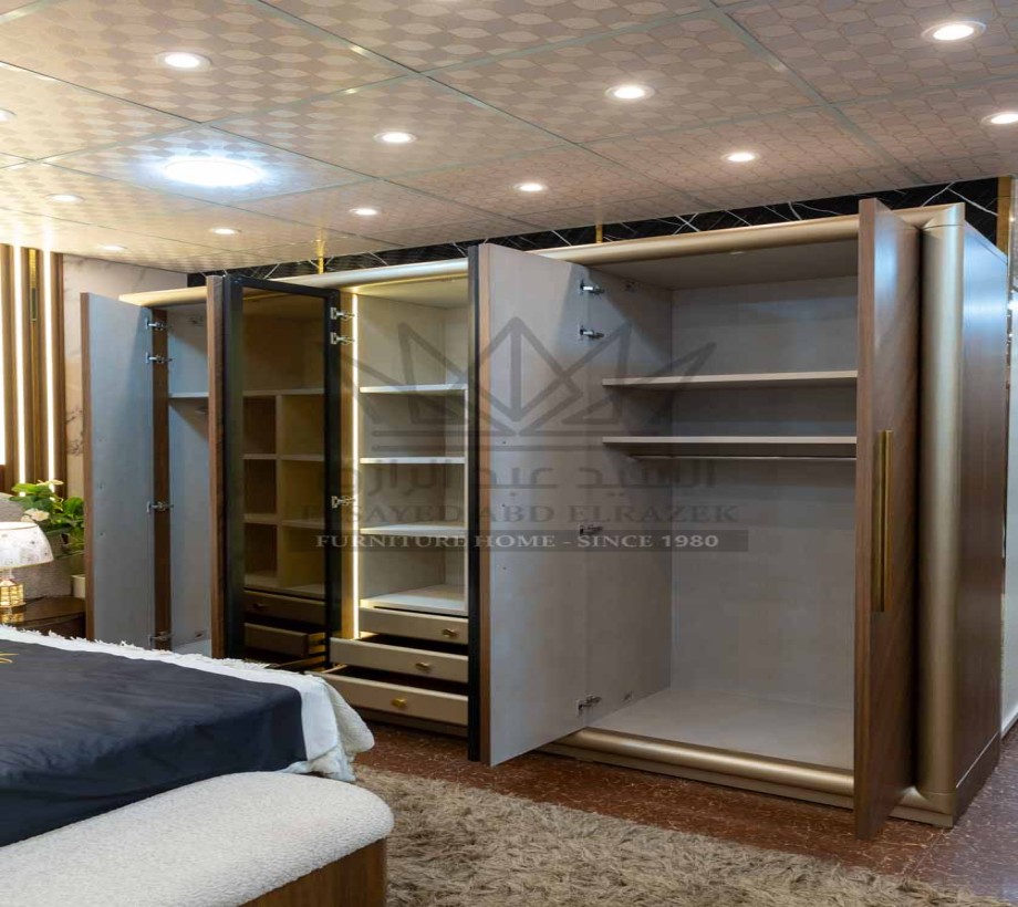 سرير . دولاب تقسيم دريسينج مع أدراج داخليه . 2 كومود . تسريحة . بف تسريحه + بانكيت مزود بمساحة تخزين