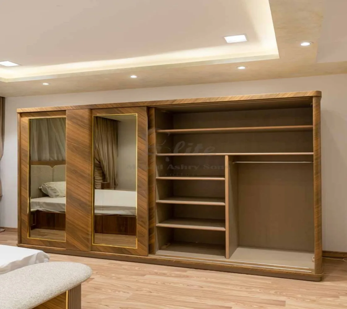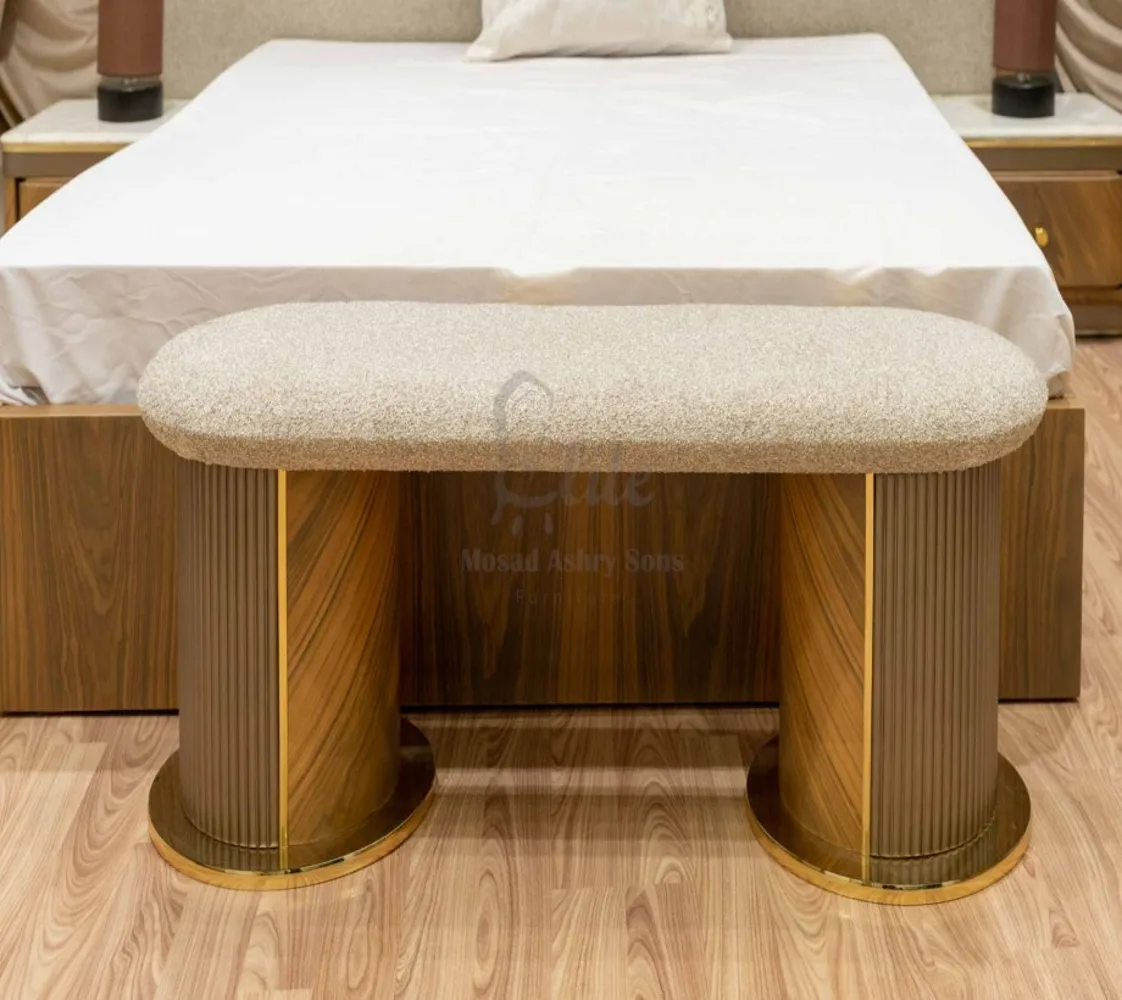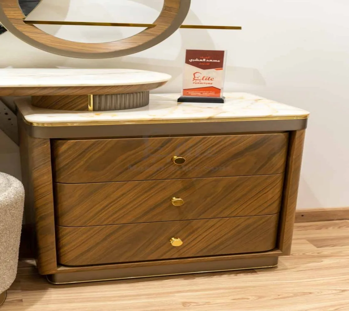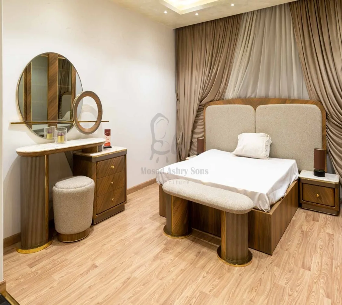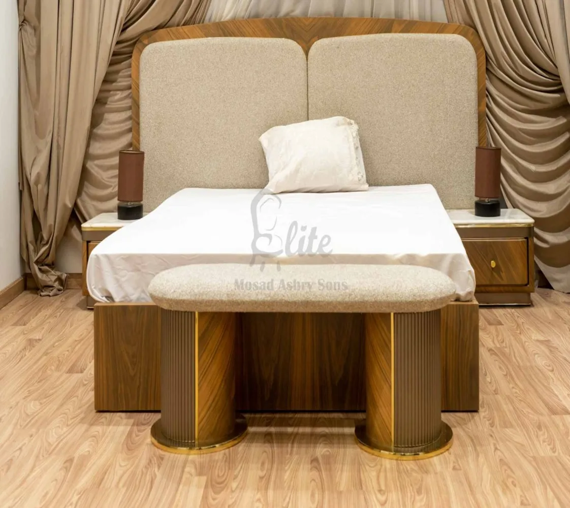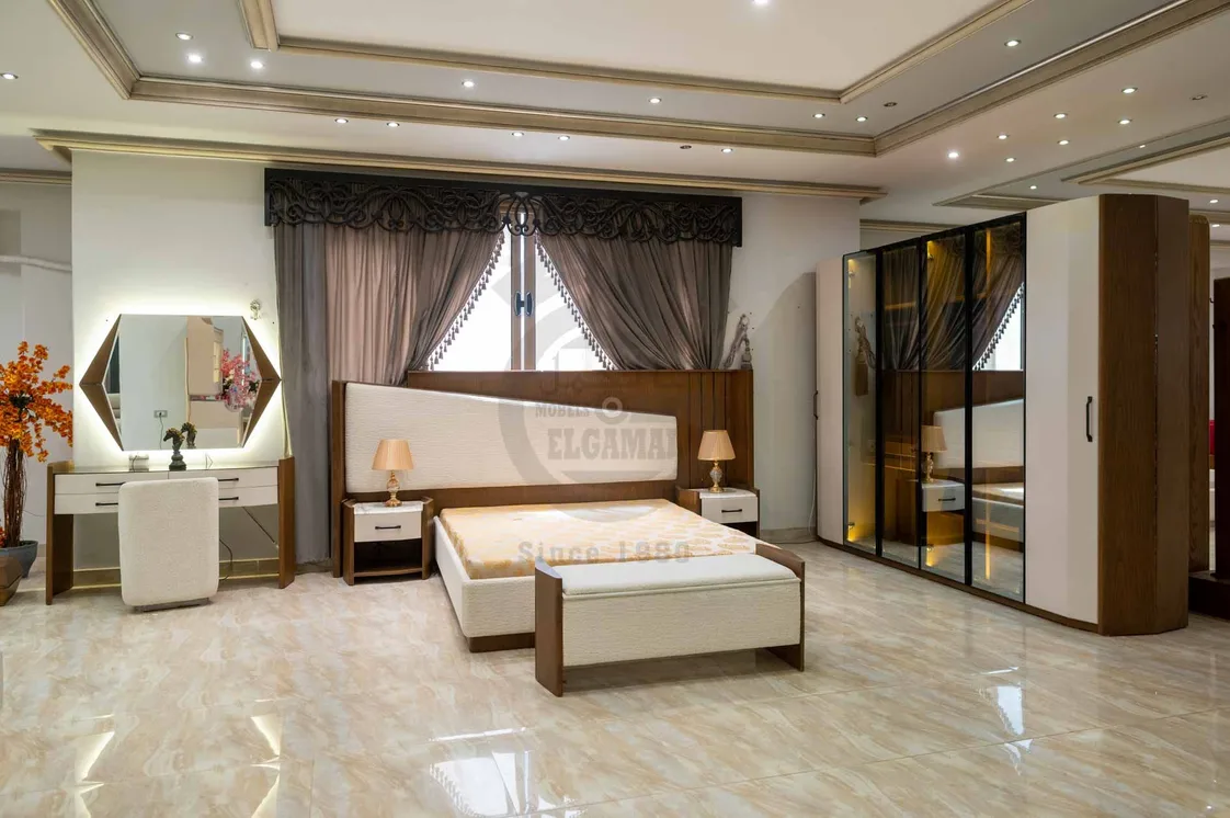 سرير . دولاب تقسيم دريسينج مع أدراج داخليه . 2 كومود . تسريحة . بف تسريحه + بانكيت مزود بمساحة تخزين