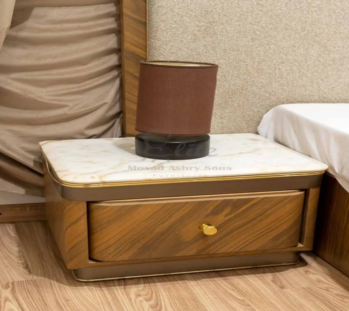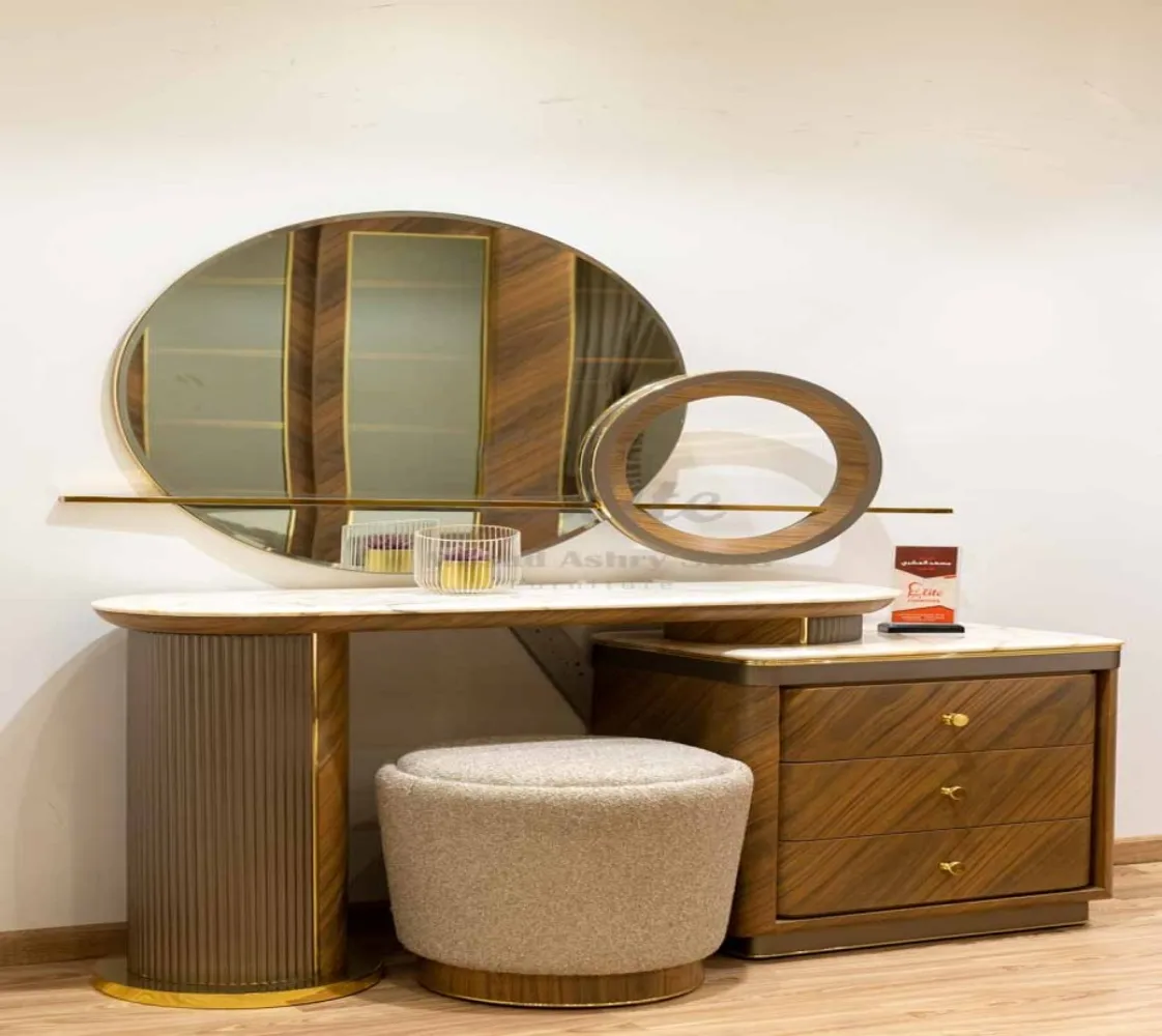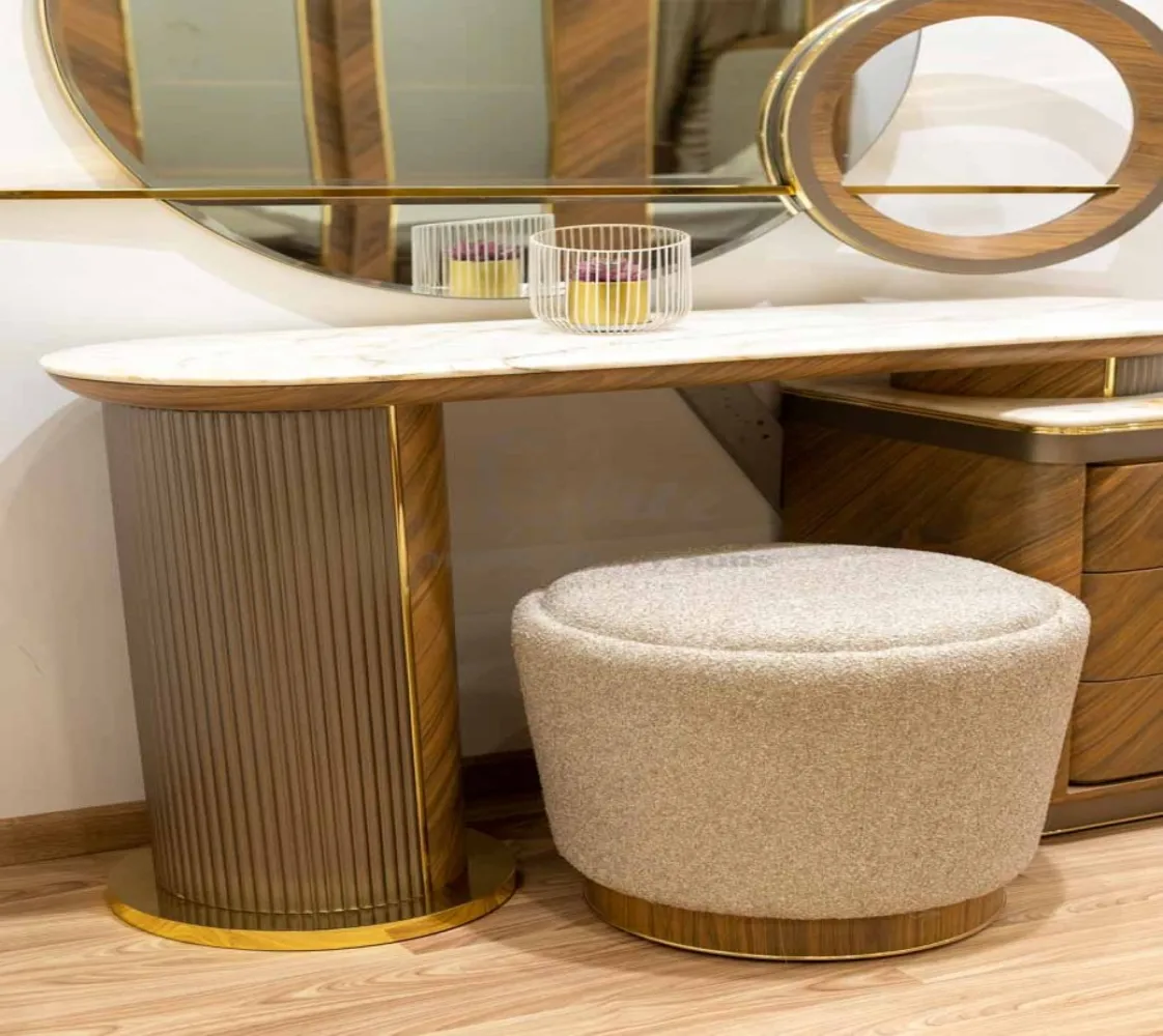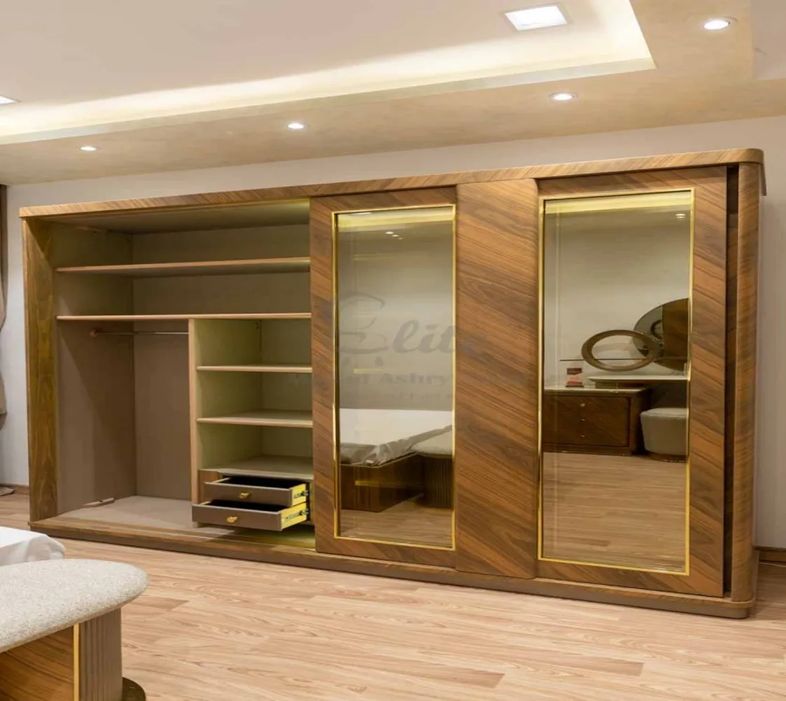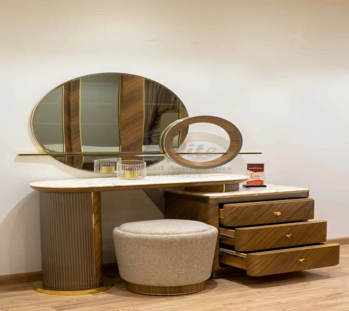 سرير . دولاب تقسيم دريسينج مع أدراج داخليه . 2 كومود . تسريحة . بف تسريحه + بانكيت مزود بمساحة تخزين