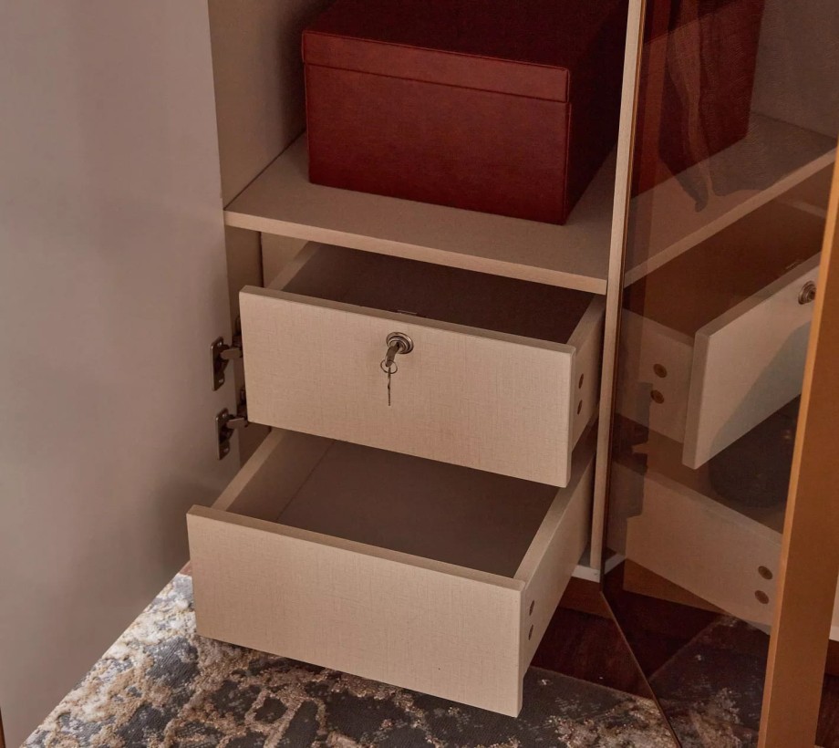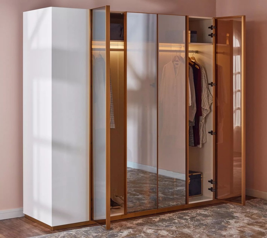 مع ستة أرفف قابلة للتعديل لتمنحك المرونة وتعديل الارتفاع حسب اختيارك، تأتي خزانة الملابس المتأرجحة هذه مع درجين مزودين بقفل ومفتاح للحفاظ على الأشياء الثمينة آمنة. مصنوعة من الخشب الهندسي، تبدو الأبواب الزجاجية العاكسة جذابة، مما يجعلها الاختيار الأمثل.