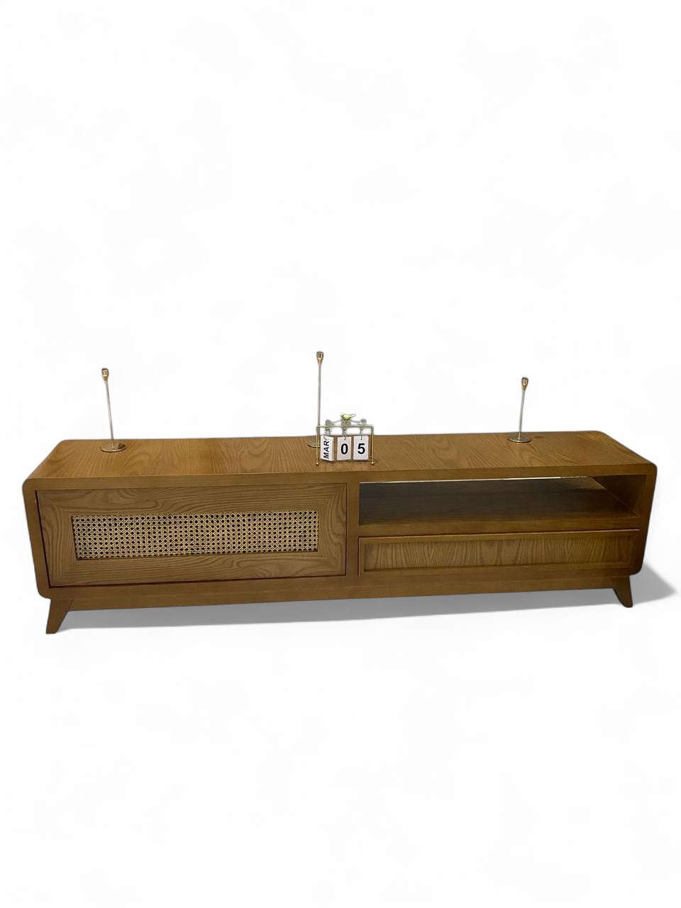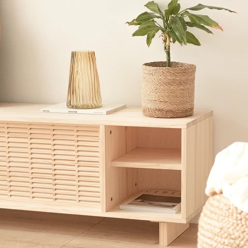 طاولة تلفزيون خشبية بتصميم عصري، مزودة بمساحة تخزين مميزة، مصنوعة من الخشب الطبيعي واللون الخشبي، أنيقة وعملية، وتلبي احتياجاتك في ترتيب وتنظيم منزلك بشكل مثالي