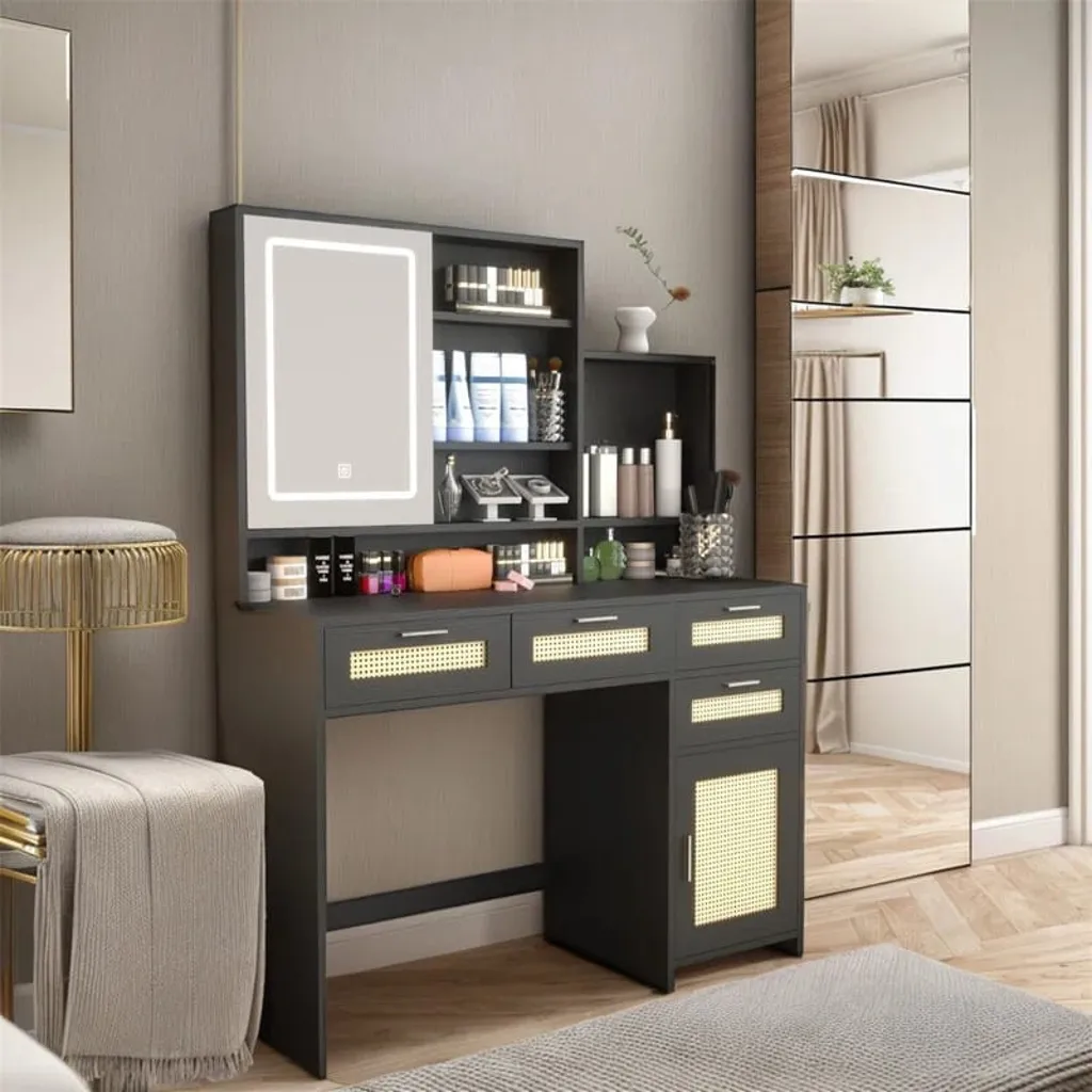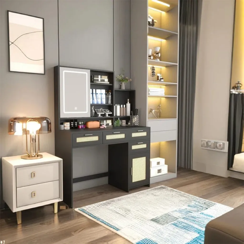 تسريحة خشبي هي قطعة أثاث فاخرة مصنوعة من الخشب الصلب عالي الجودة. تأتي بلون أسود أنيق ومقاسات مثالية للاستخدام اليومي في غرفة النوم. ومزودة بالداخل بمساحات تخزين وتضم مقعد جميل