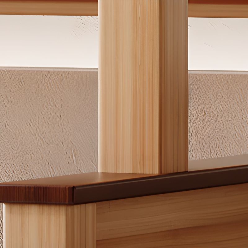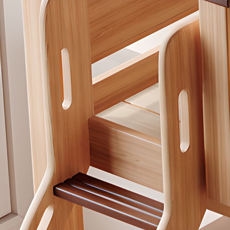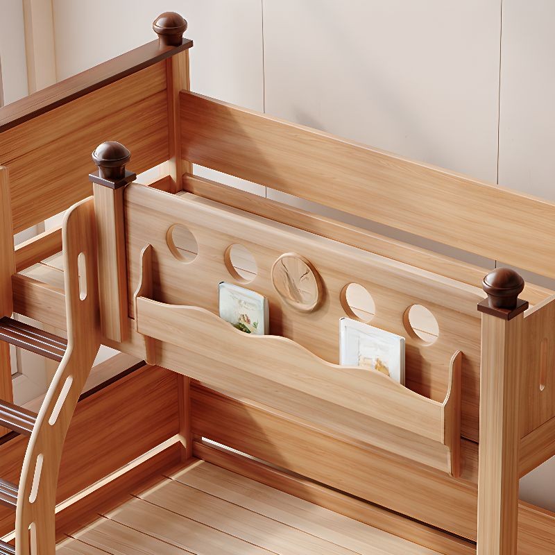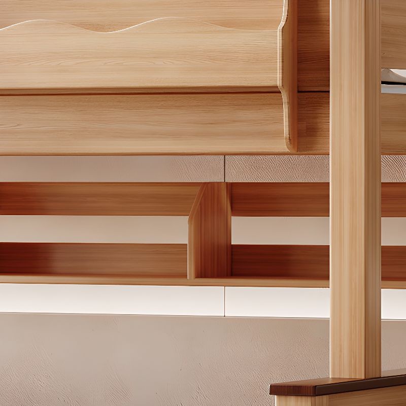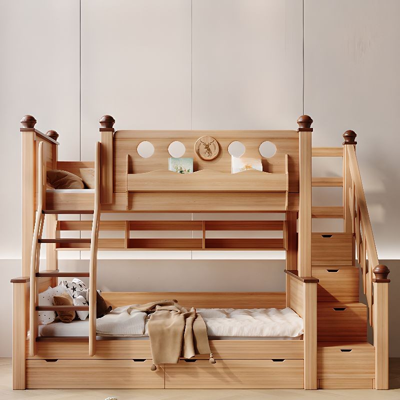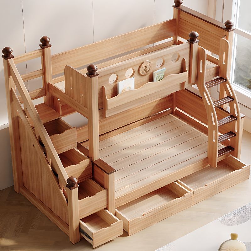 سرير أطفال بطابقين مع مساحة تخزين للكتب وأدراج للتخرزين ولوح قدم خشبي بلون الخشب