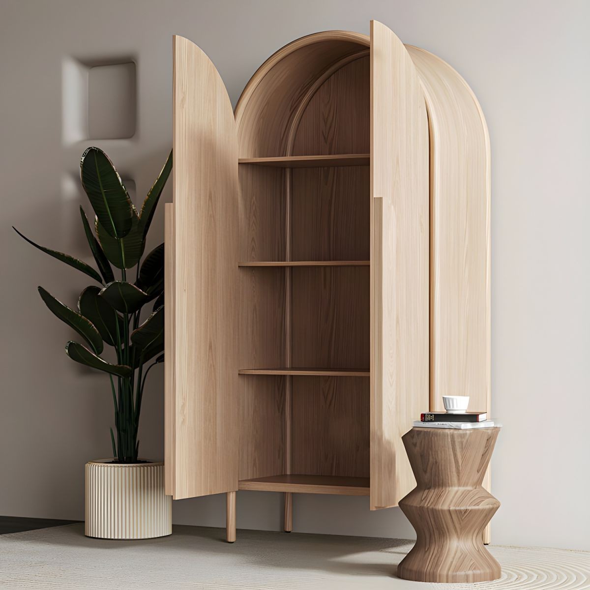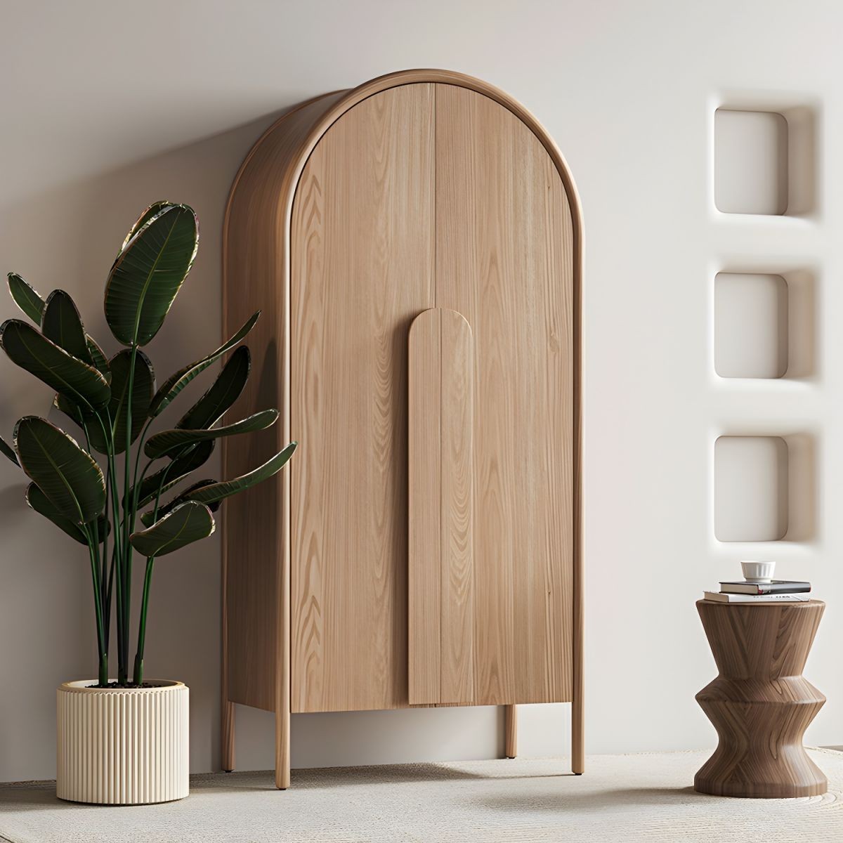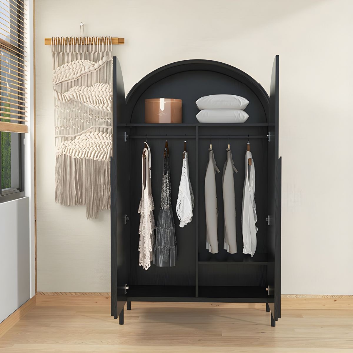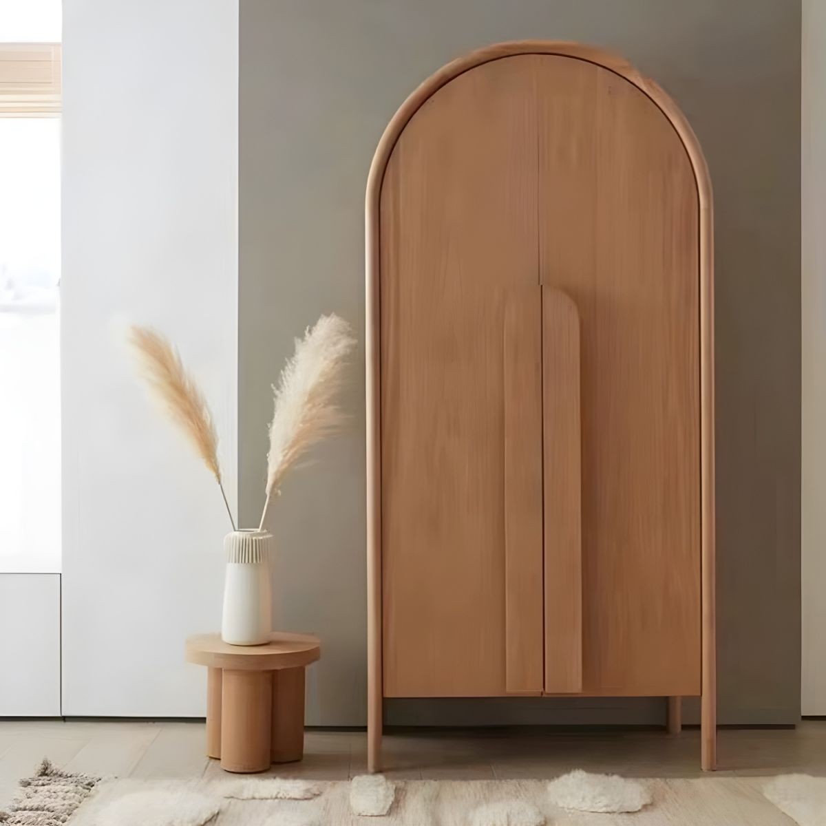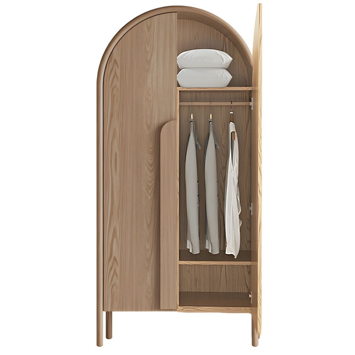خزانة ملابس للأطفال مصنوعة من أخشاب طبيعية باللون الخشبي مع أرفف وقضيب ملابس وباب بسيط