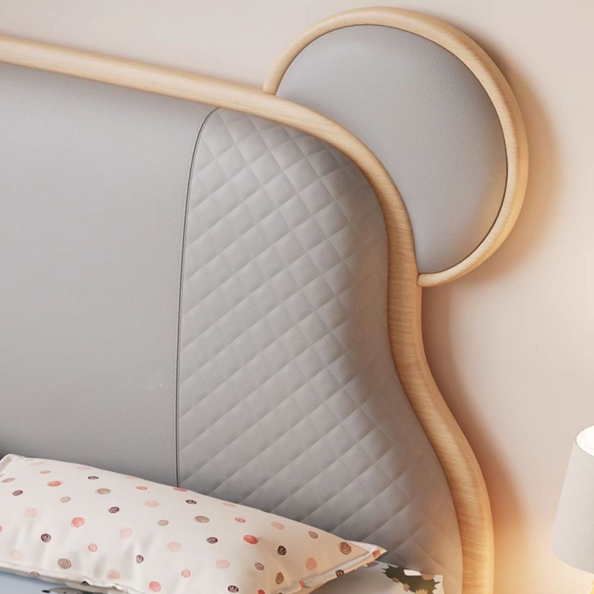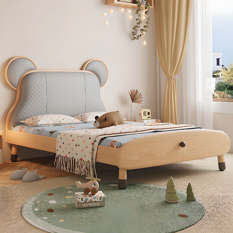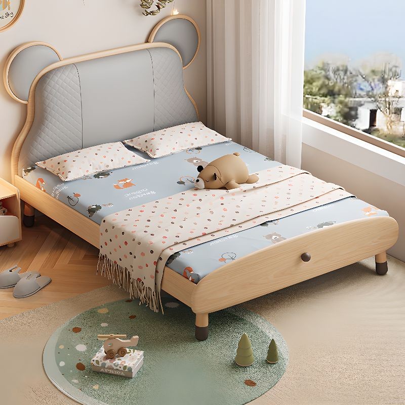 سرير أطفال بتصميم يجمع بين البساطة واللمسة الطفولية، مصنوع من الخشب بلون هادئ وهيكل منخفض مدعوم بأرجل قصيرة. يأتي رأس السرير مبطنًا باللون الرمادي مع تفاصيل مستوحاة من أذني دب، مما يضيف لمسة مرحة أنيقة ومحببة.