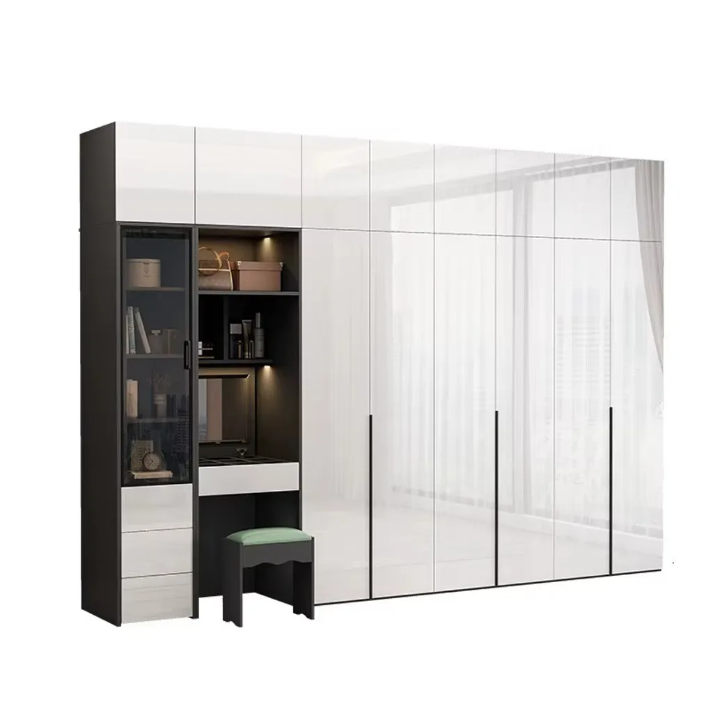 دولاب ملابس عصري بلون أبيض لامع ومقابض سوداء طويلة تمنحه مظهرًا أنيقًا ومميزًا. يحتوي في أعلاه على مجموعة من الأبواب الصغيرة للتخزين الإضافي. في الجانب، يوجد جزء جانبي متكامل يضم مرآة صغيرة مدمجة، مجموعة من الرفوف المتدرجة، دُرج سفلي، وبف صغير بمقعد مبطن يوفر راحة عملية.