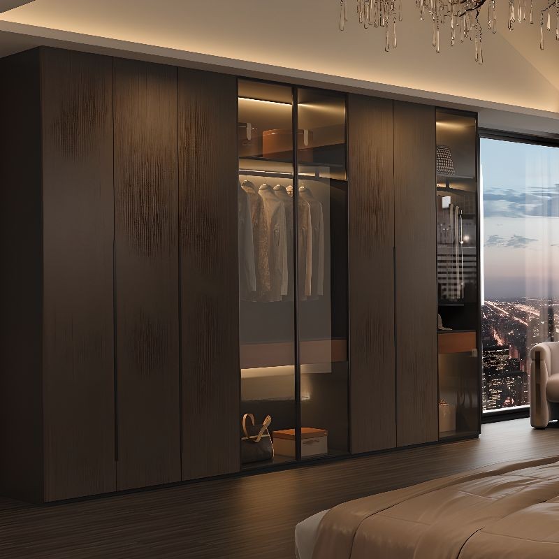 دولاب ملابس خشبي بتصميم عمودي أنيق مع أبواب زجاجية مضيئة