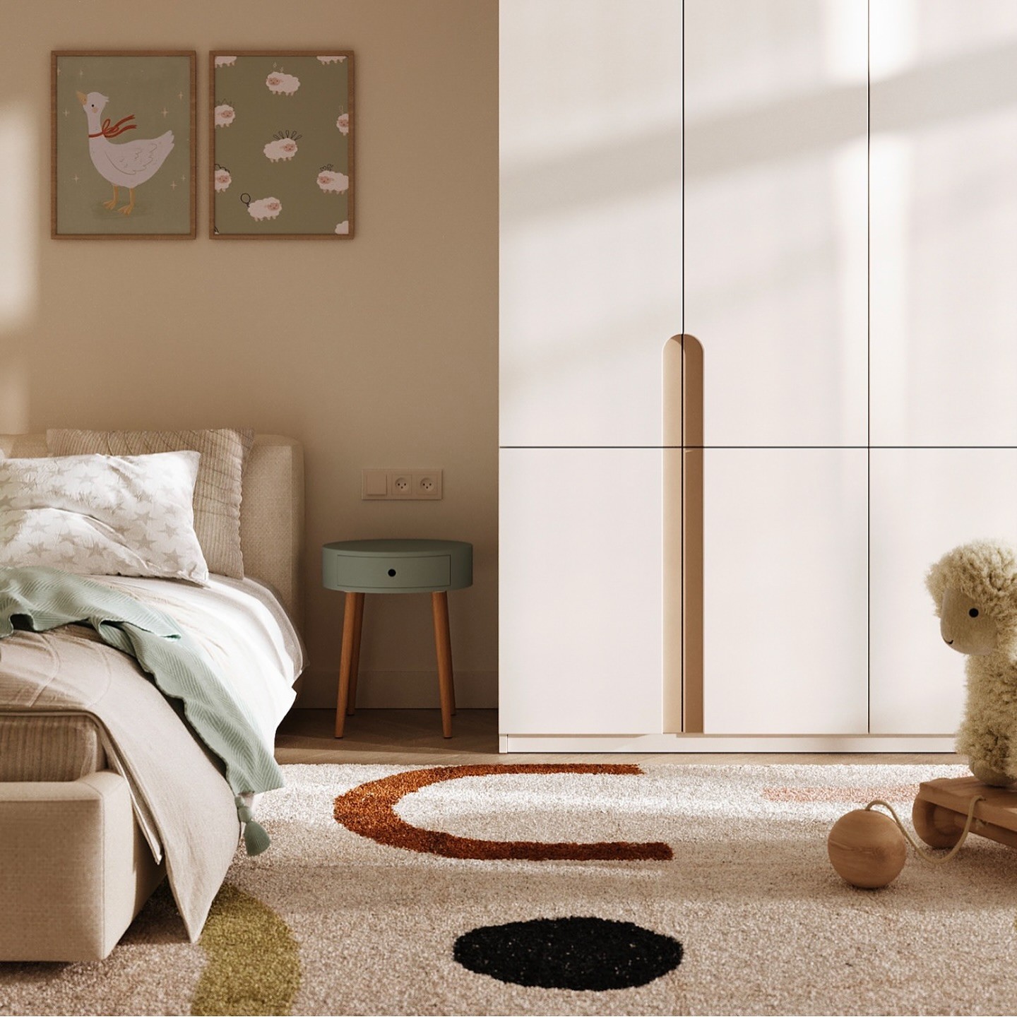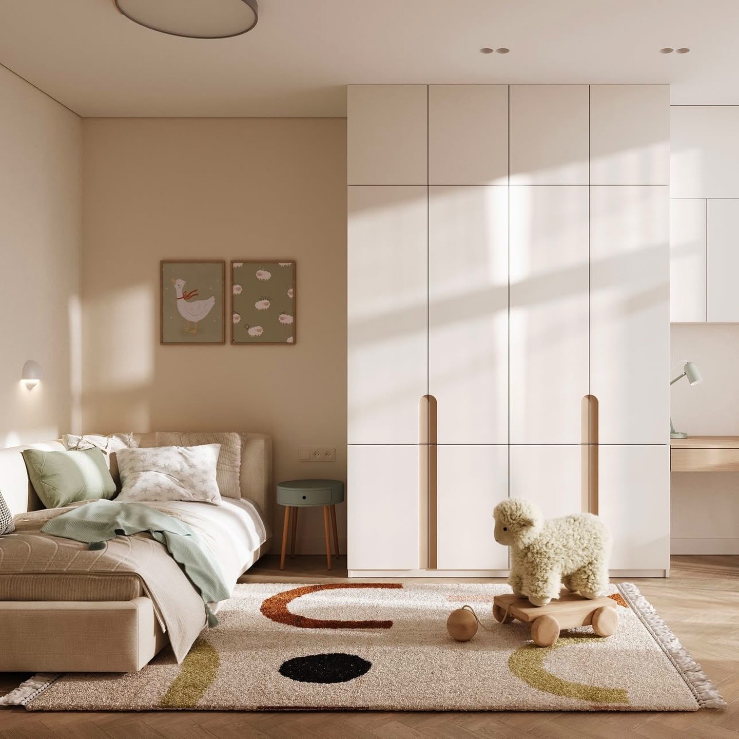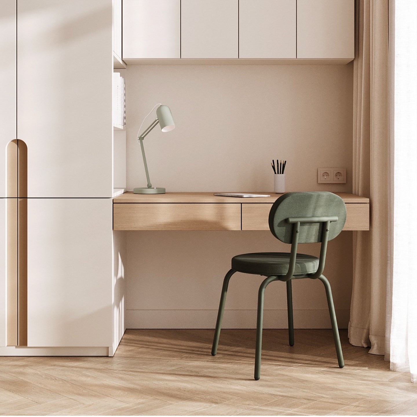 يأتي بجانب الدولاب مكتب مدمج بلون خشبي طبيعي، بسطح عملي يمتد أفقيًا ويشمل درجين سفليين، مع وحدات تخزين علوية مغلقة لتكامل مثالي بين التخزين والعمل.