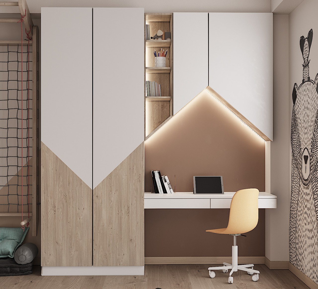 بجانب الدولاب، يأتي المكتب المدمج بتصميم عملي بسطح أبيض واسع مناسب للدراسة أو استخدام الأجهزة، ويحتوي على درجين سفلين للتخزين. يعلوه وحدة تخزين مغلقة بجوارها رفوف مفتوحة لسهولة التنظيم.