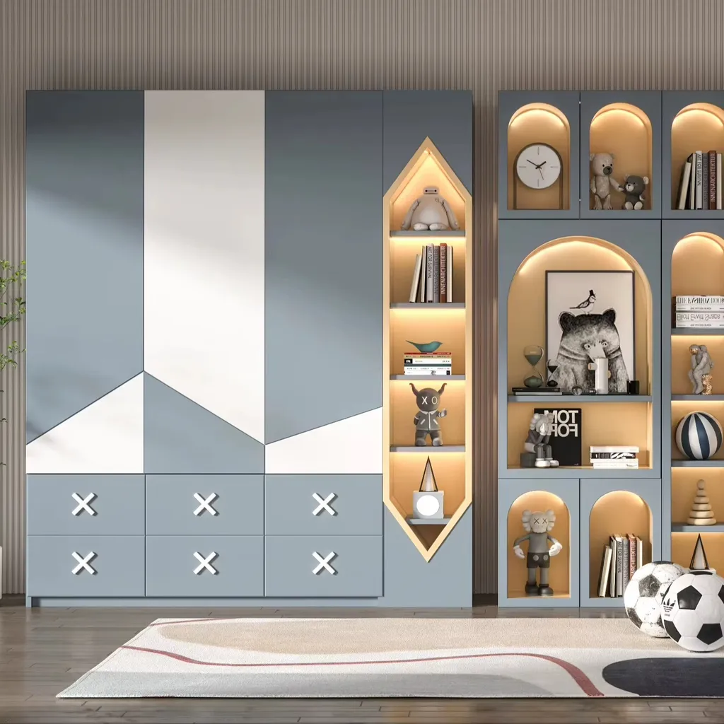 دولاب عصري مكوّن من ثلاث وحدات متجاورة، يجمع بين الأدراج، الأرفف المفتوحة، والأبواب المغلقة ليمنح المستخدم أقصى درجات الوظيفة والتنظيم.