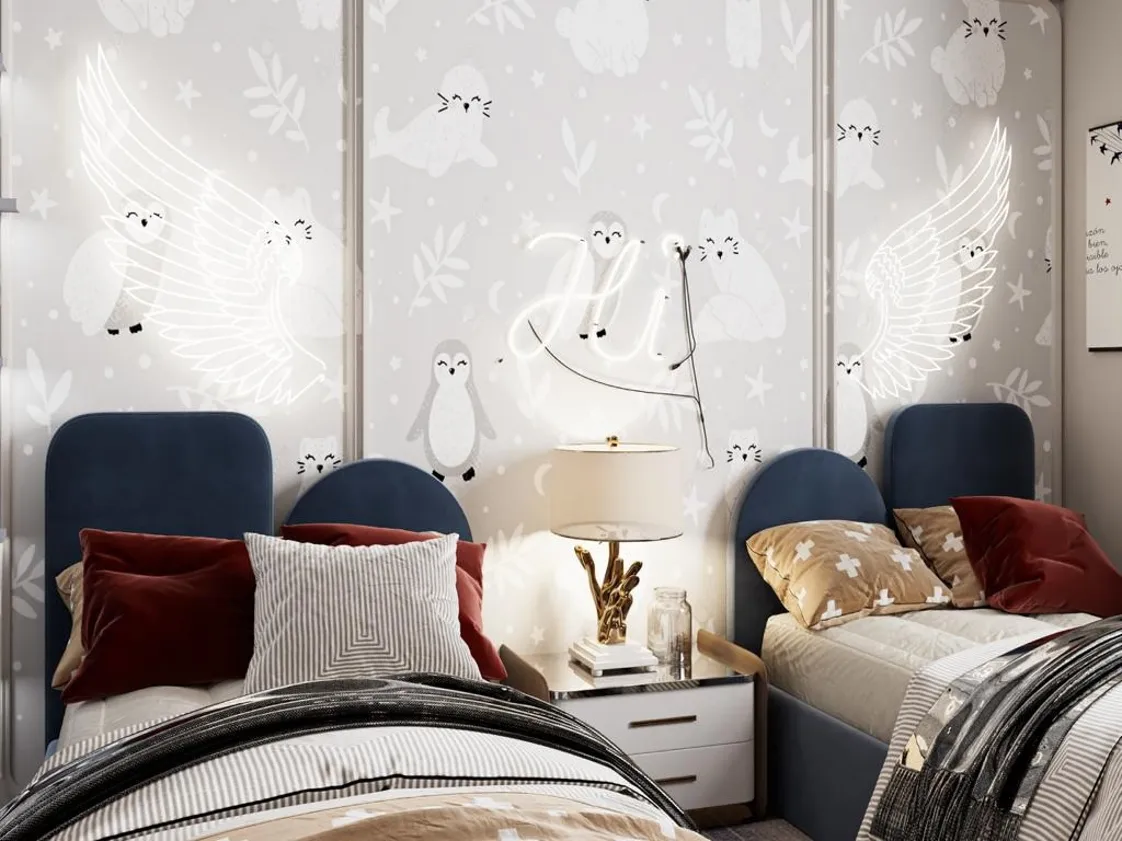 تحتوي الغرفة على سريرين منفصلين بتصميم أنيق، يتميز كل منهما بلوح رأس منحنٍ بلمسة ناعمة وألوان متناسقة تضيف لمسة جمالية راقية.