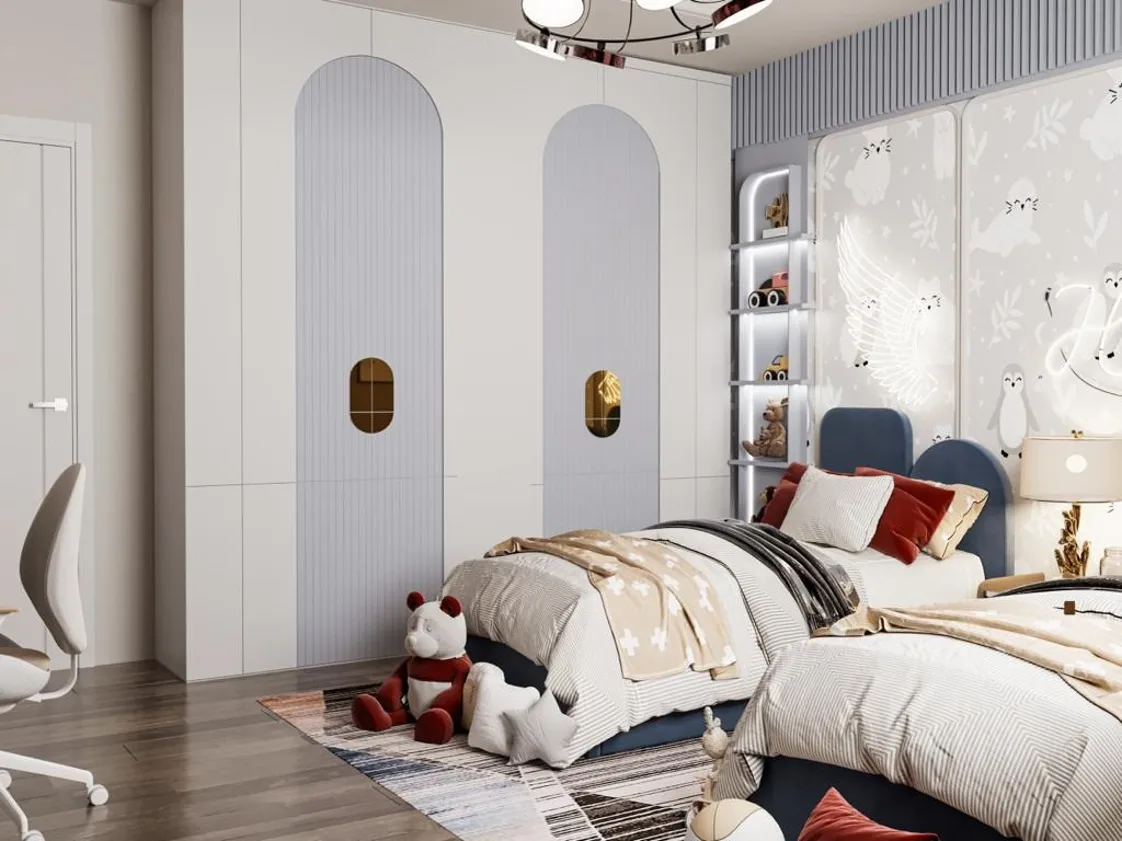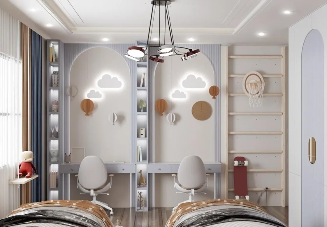 تشمل الغرفة أيضًا مكتبين بتصميم مستطيل بسيط يقدمان سطح عمل واسع للدراسة أو الأنشطة الإبداعية، ويكتمل التكوين بكرسيين مريحين بظهر ومقعد مبطنين، وقاعدة بيضاء متحركة قابلة للتعديل.