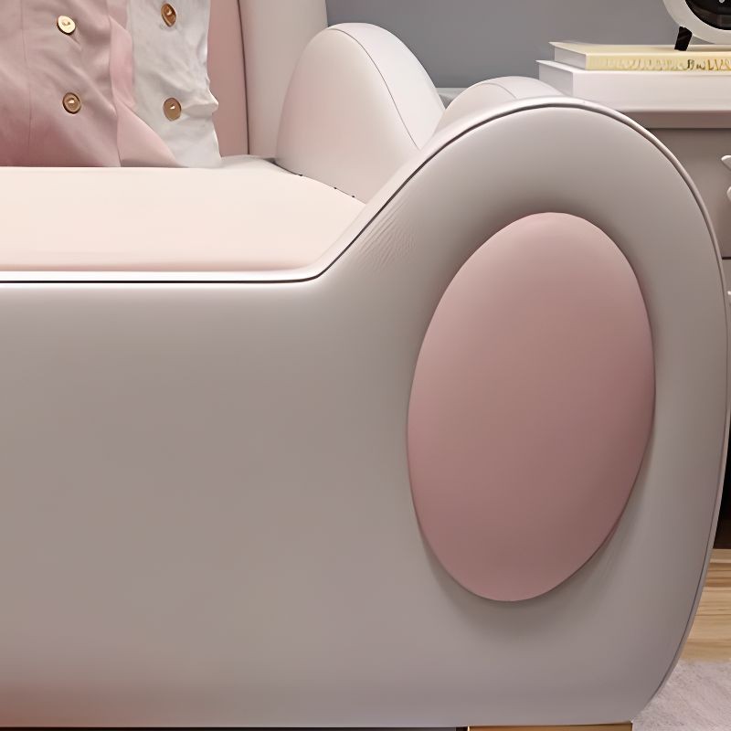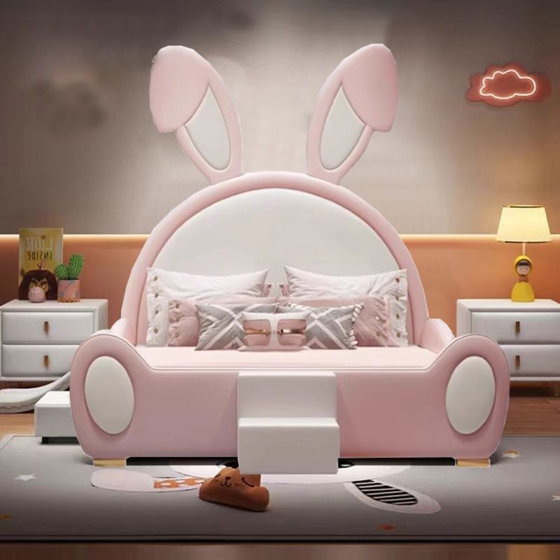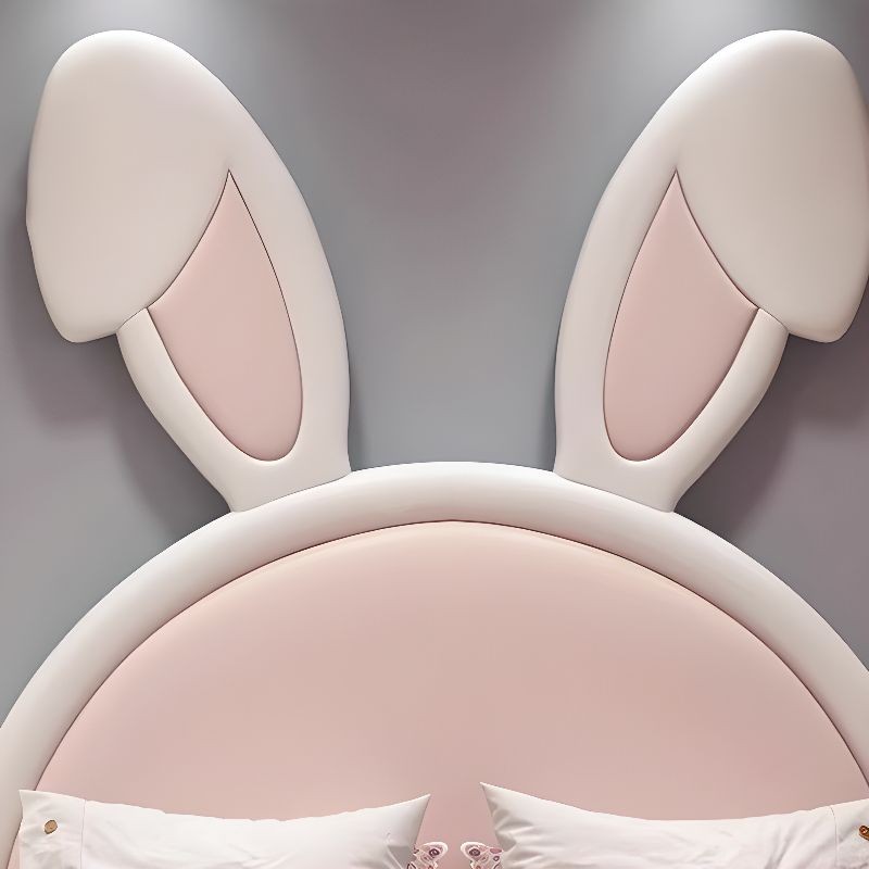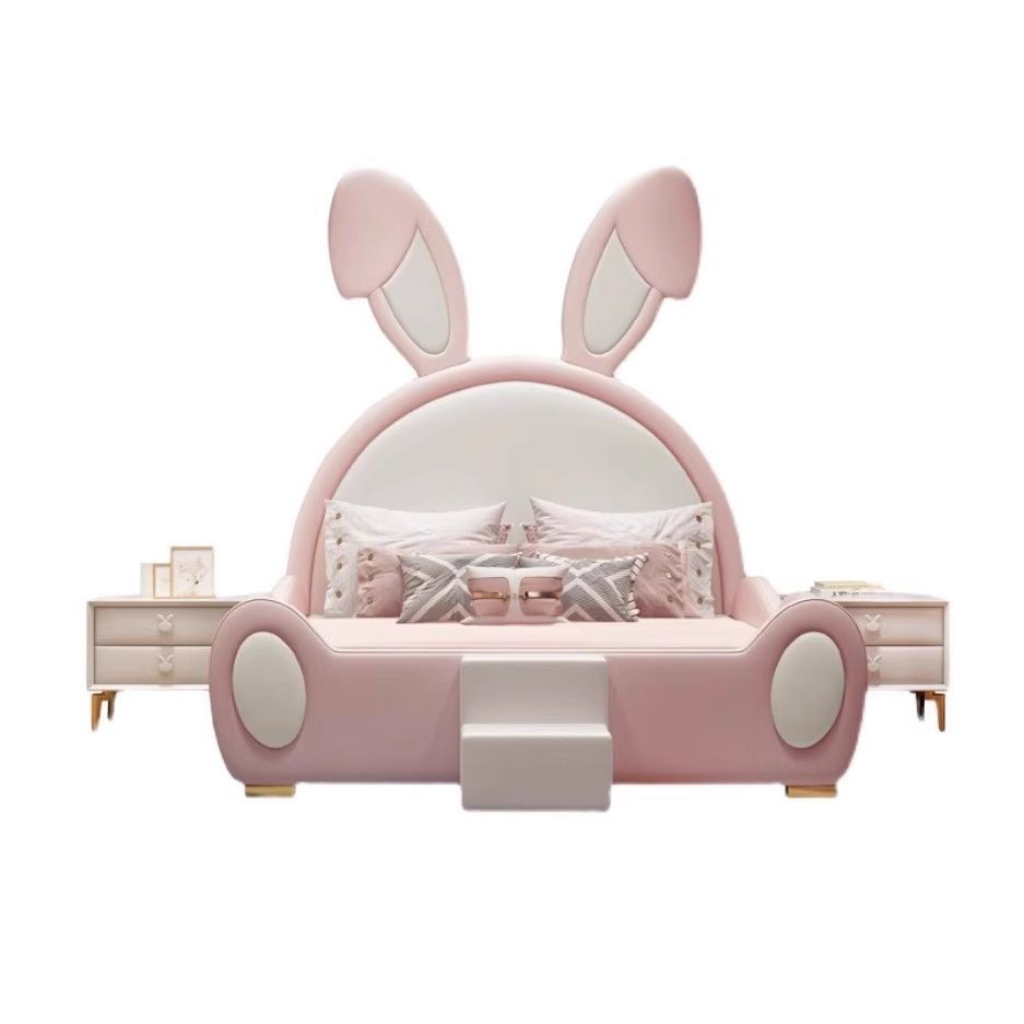سرير أطفال بتصميم أرنب مبتكر، يتميز بلونه الوردي الفاتح ومسند ظهر نصف دائري مزوّد بأذنين كبيرتين تضفيان لمسة مرحة على الغرفة. السرير مبطّن بالكامل ليوفر الراحة والأمان، ويحتوي على درجة أمامية صغيرة تساعد الطفل على الصعود بسهولة.