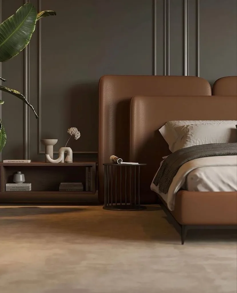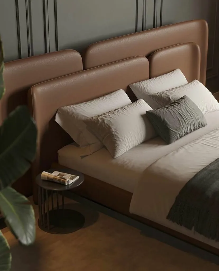 سرير بتصميم عصري منخفض، مصنوع من الخشب المتين ومبطن بالجلد البني الفاخر، ليمنح الغرفة مظهرًا أنيقًا وهادئًا. يتميز لوح الرأس بتقسيم هندسي إلى أربعة أجزاء مبطنة، تعزز الراحة وتضفي لمسة تصميمية متوازنة. تأتي القاعدة أيضًا مبطنة بالكامل لتمنح السرير مظهرًا متماسكًا وثباتًا بصريًا، بينما تضفي الأرجل الصغيرة باللون الأسود دعامة قوية ولمسة عصرية خفية. خيار مثالي لغرف النوم التي تجمع بين البساطة والفخامة.