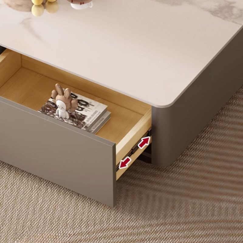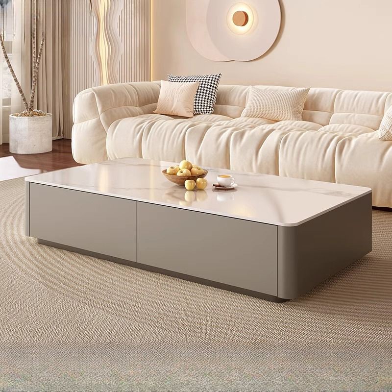 ترابيزة قهوة أنيقة بتصميم مستطيل، تأتي بلون رمادي فاتح وسطح لامع عاكس يضفي لمسة عصرية راقية على المساحة المحيطة. التصميم يتضمن درجين جانبيين مدمجين يوفران مساحة تخزين عملية ومنظمة للعناصر الصغيرة مثل الكتب أو الريموت كنترول.
