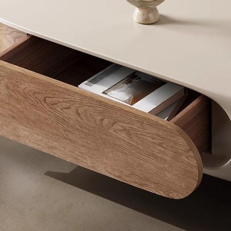 ترابيزة قهوة بيضاوية الشكل بلون كريمي هادئ تضفي لمسة من الرقي والعصرية على مساحة المعيشة. تأتي بحواف منحنية ناعمة تزيد من الأمان وتكمل التصميم الأنيق. تضم درجين خشبيين عمليين قابلين للسحب من الجانبين لتوفير مساحة تخزين مثالية للأغراض اليومية. يجمع التصميم بين اللون الكريمي والخشبي في تناغم بصري جذاب، يجعلها قطعة مثالية لأي غرفة معيشة عصرية.
