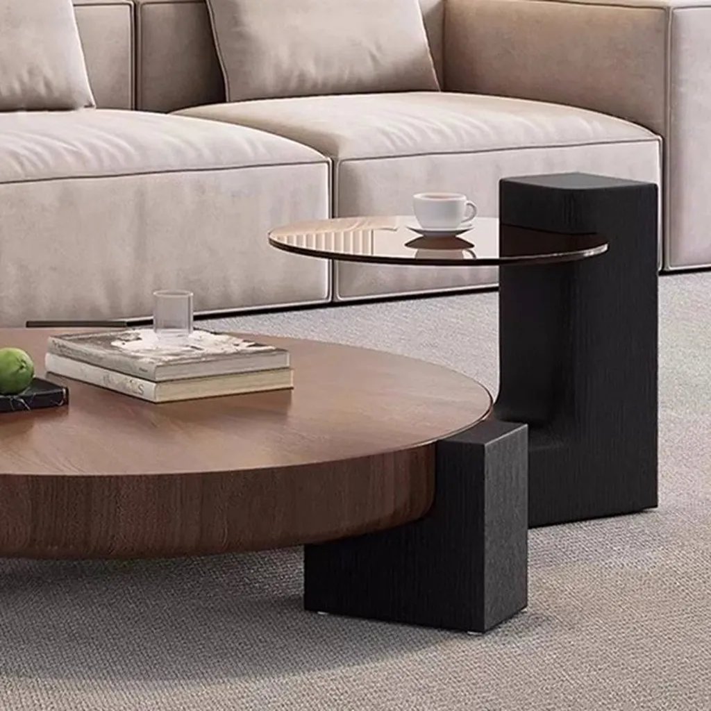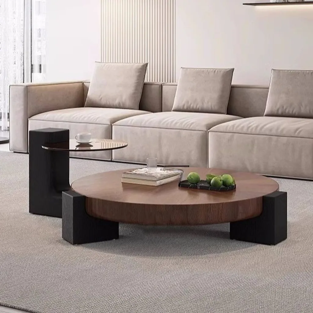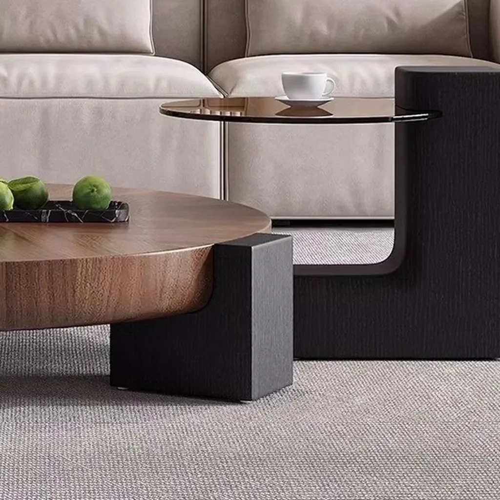 ترابيزة قهوة عصرية مكونة من قطعتين بتصميم هندسي راقٍ. القطعة الرئيسية دائرية بسطح خشبي بني أنيق وقاعدة سوداء متينة بتكوين هندسي يضفي طابعًا عصريًا وثباتًا بصريًا. أما القطعة الثانية فهي جانبية أصغر حجمًا، بسطح زجاجي دائري وقاعدة سوداء مصممة بخطوط فنية مبتكرة، ما يعزز الطابع العملي ويضيف لمسة ديكورية فريدة. هذا التصميم يجمع بين الأناقة والبساطة ويكمل أثاث غرف المعيشة الحديثة بأسلوب متوازن.