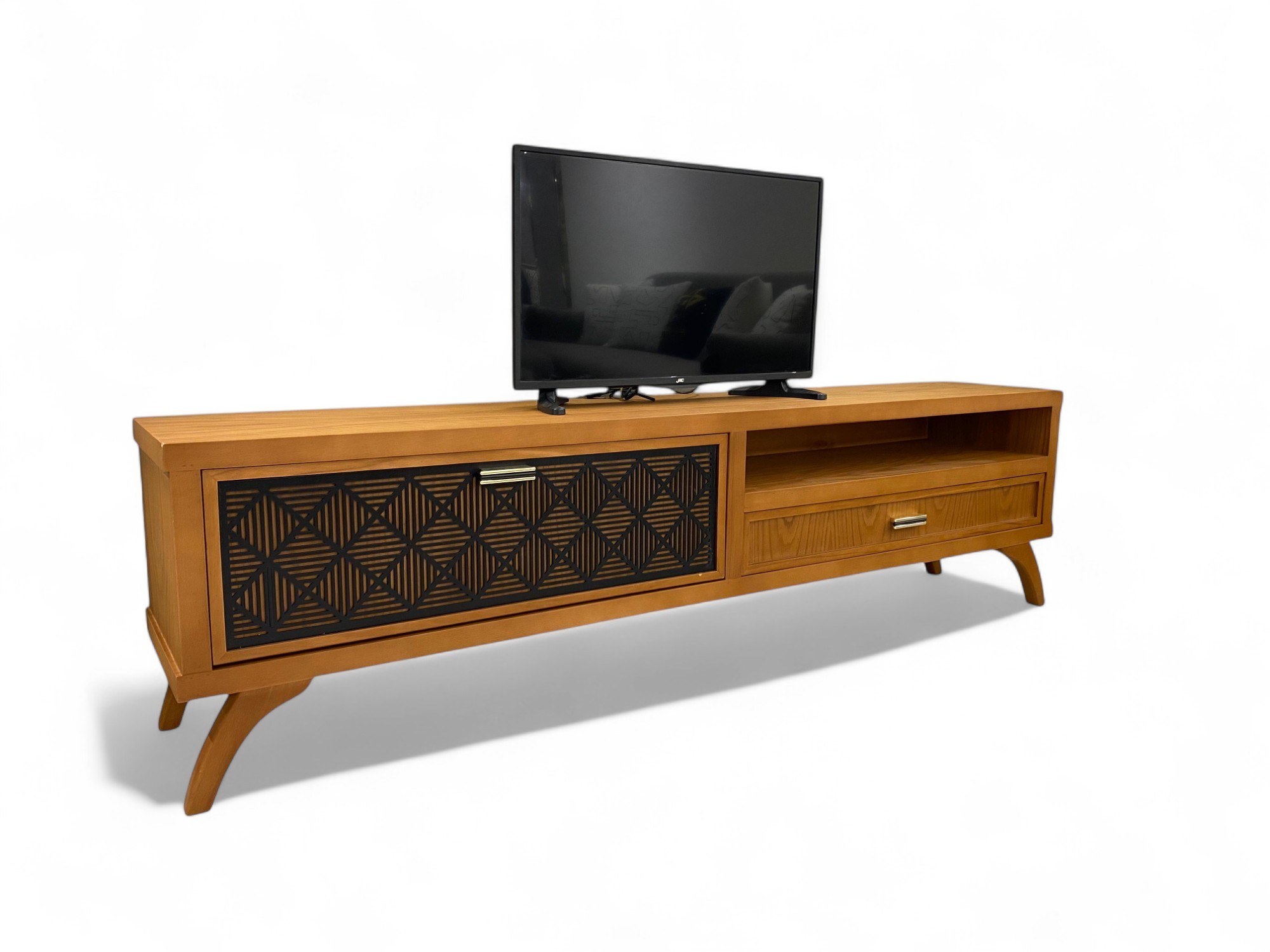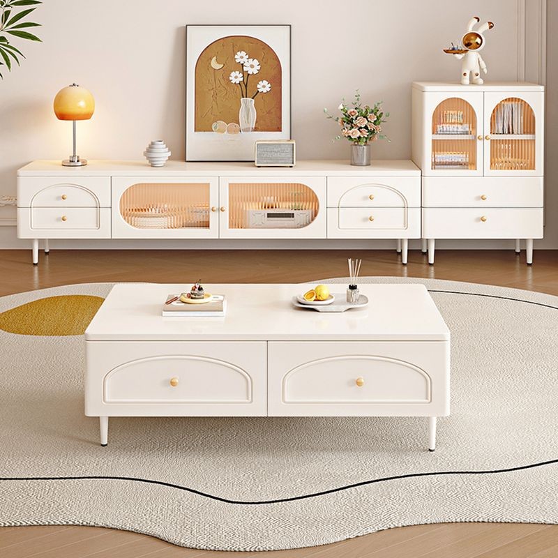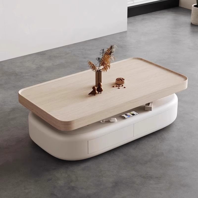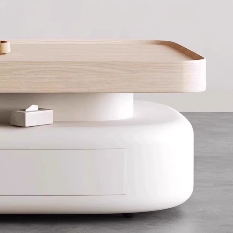 ترابيزة قهوة عصرية بتصميم انسيابي يجمع بين الأناقة والوظيفة. سطح مستطيل بحواف دائرية بلون خشبي دافئ يضفي لمسة فاخرة، يرتكز على قاعدة بيضاوية باللون الأبيض تحتوي على وحدات تخزين مدمجة بتصميم مخفي. التباين بين الألوان والخطوط البسيطة يمنح الطاولة مظهرًا عصريًا مريحًا ومثاليًا للمساحات الحديثة.