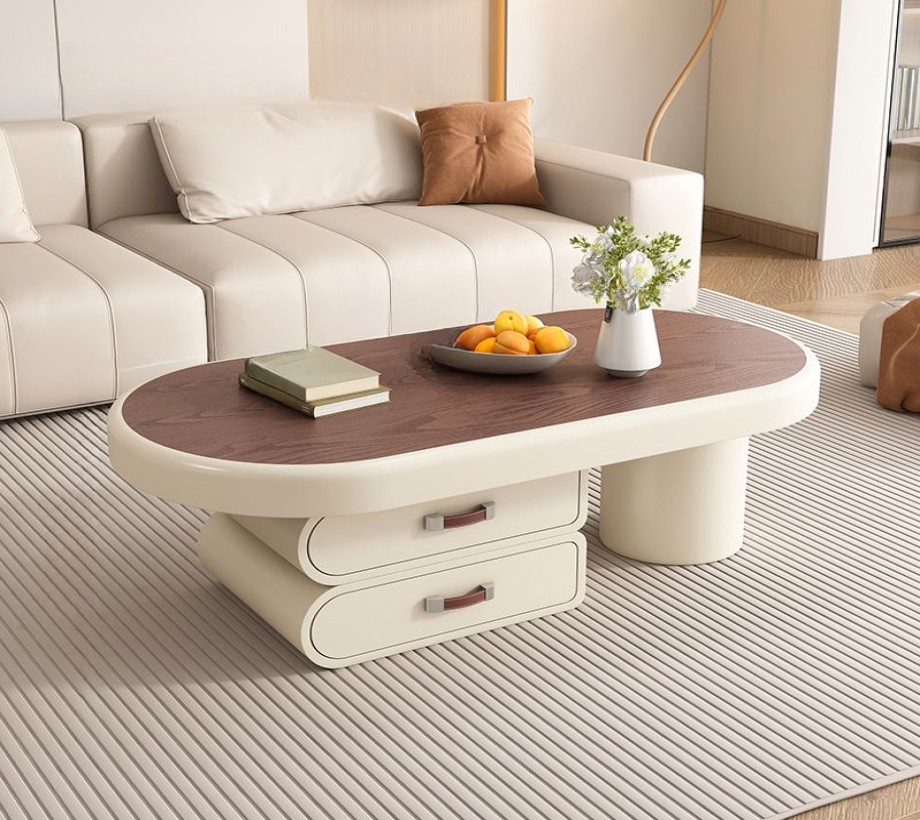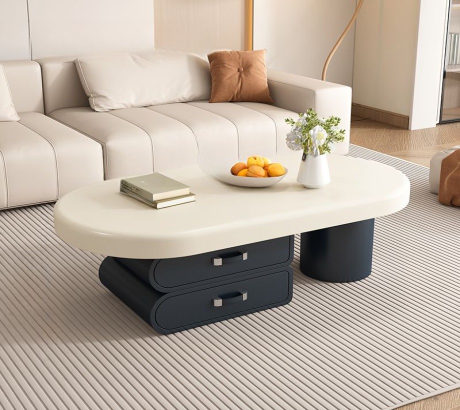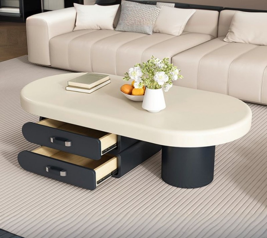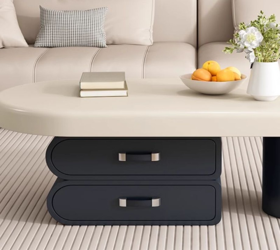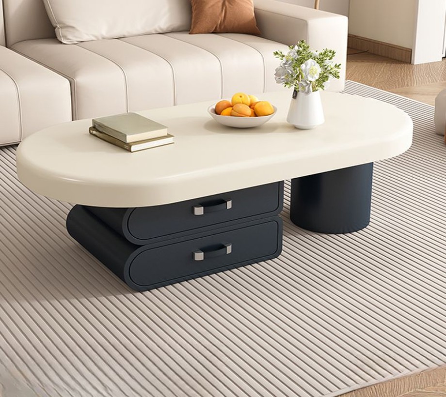 ترابيزة القهوة هذه تتميز بتصميم بيضاوي عصري وأنيق بلون أبيض كريمي، مما يضيف لمسة من الرقي إلى أي مساحة داخلية. تشمل الترابيزة درجين مستطيلين في الجزء السفلي، كل منهما مزود بمقبض معدني رمادي مع تفاصيل بنية، مما يضفي عليها تباينًا جذابًا ويتكامل بشكل رائع مع التصميم العام.