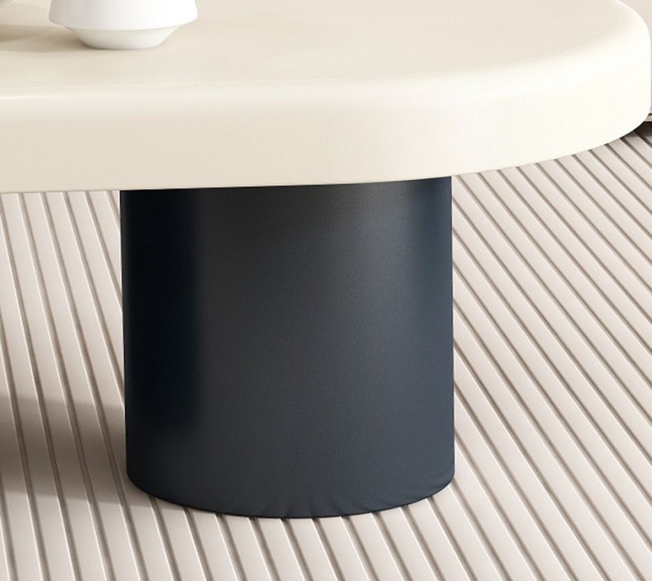 الترابيزة تستند إلى قاعدة أسطوانية على الجانب الأيمن وقاعدة مستطيلة على الجانب الأيسر، مما يمنحها ثباتًا ويعزز التوازن الجمالي في هيكلها. يجمع تصميمها بين الوظيفة والجمال، مما يجعلها إضافة مثالية لأي غرفة معيشة أو مساحة داخلية تحتاج إلى لمسة فاخرة.