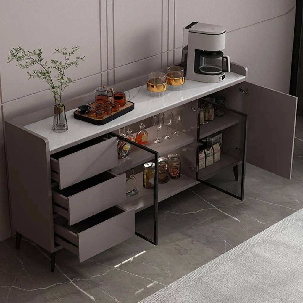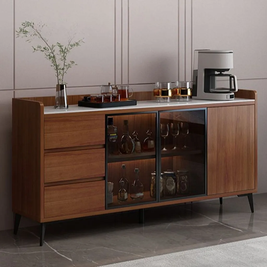 ركن قهوة بأدراج للتخزين بتصميم عصري، مصنوع من خشب طبيعي، يتميز بمظهر أنيق وتخزين فعال.