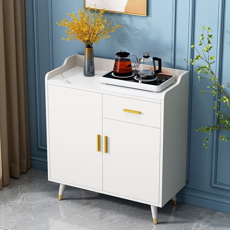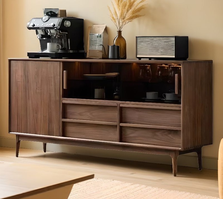 ركن قهوة بأدراج للتخزين بتصميم عصري، مصنوع من خشب طبيعي، يتميز بمظهر أنيق وتخزين فعال.