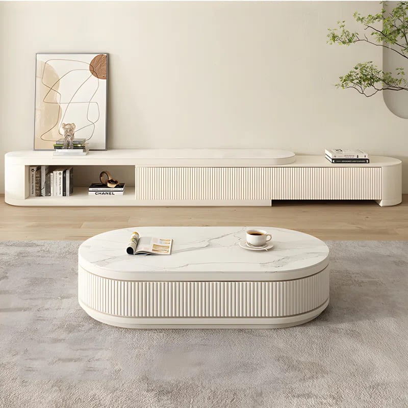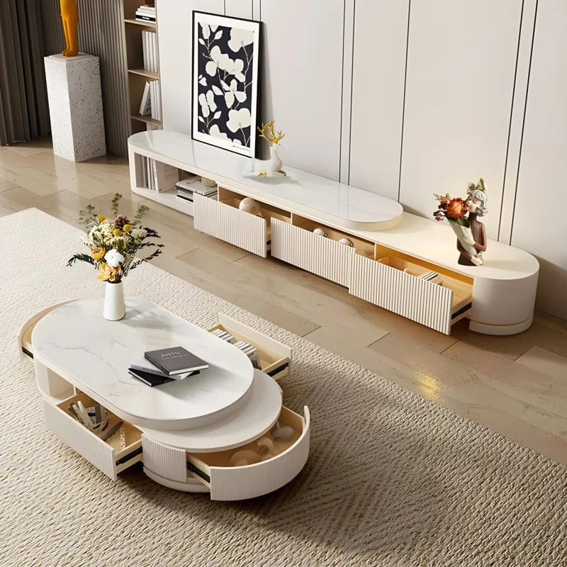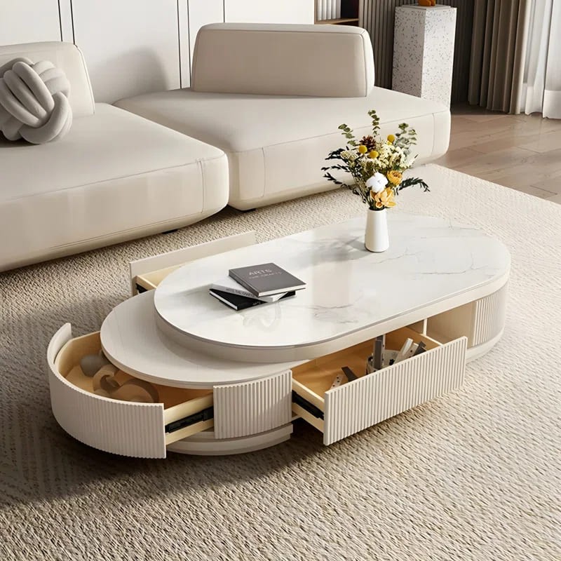 تم تصميم مجموعة طاولات القهوة لتكون ضرورية في العصر الحديث، ومثالية لإضفاء لمسة راقية على أي مساحة. طاولة قهوة بيضاوية بها مساحة تخزينية وأدراج وقابلة للتمدد.