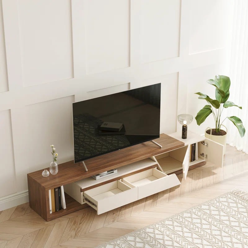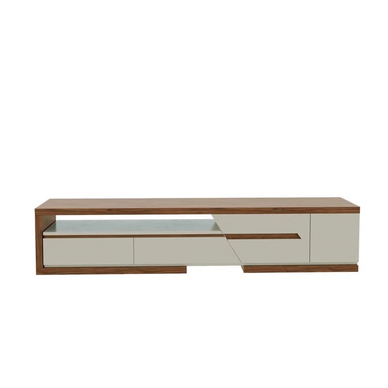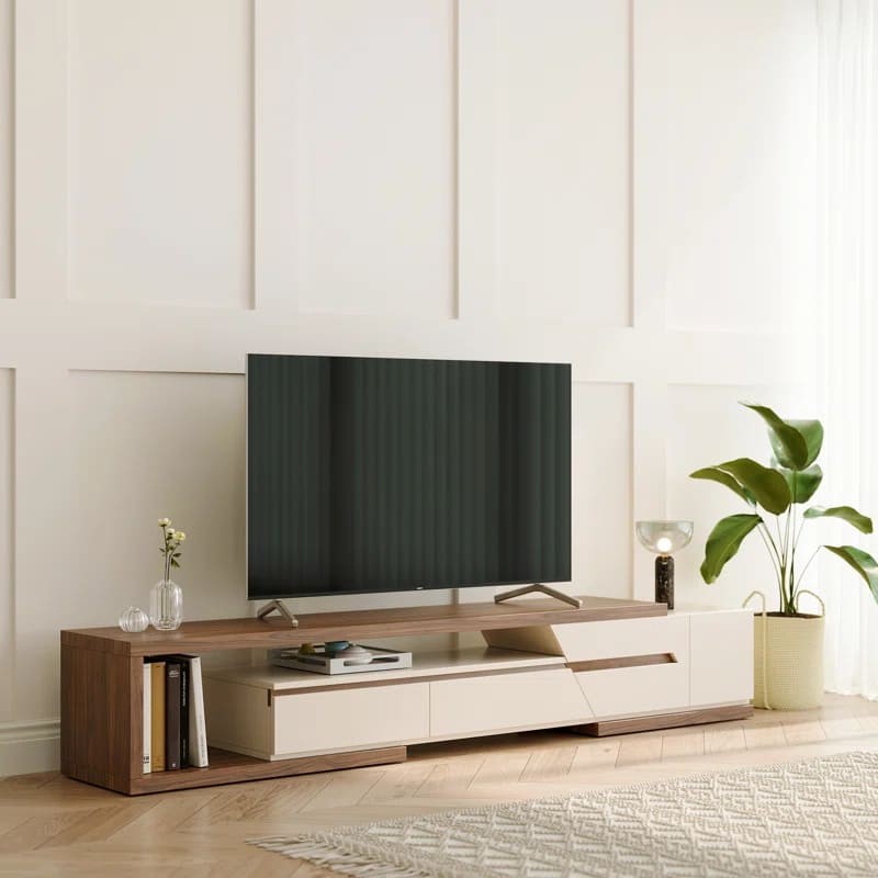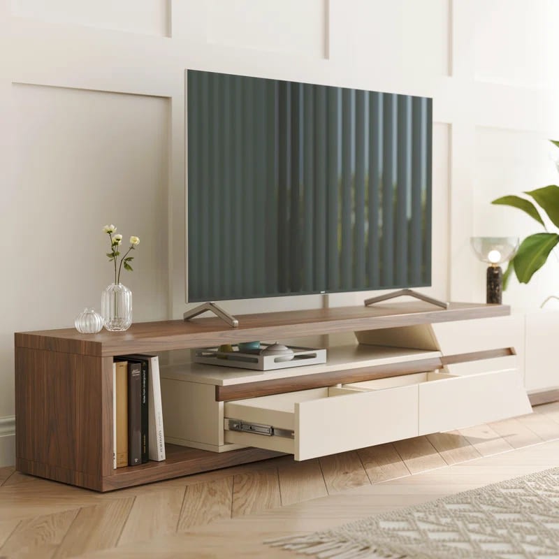 ترابيزة تلفزيون خشبية عصرية مزودة بأدراج وأرفف لمساحة تخزين مميزة، مصنوعة من الخشب الطبيعي، أنيقة وعملية، وتلبي احتياجاتك في ترتيب وتنظيم منزلك بشكل مثالي .