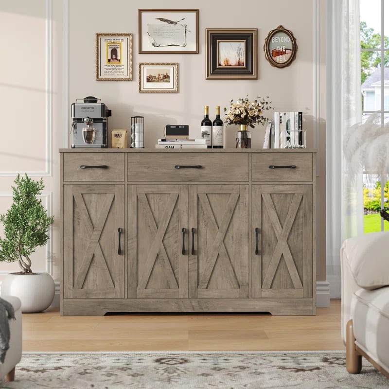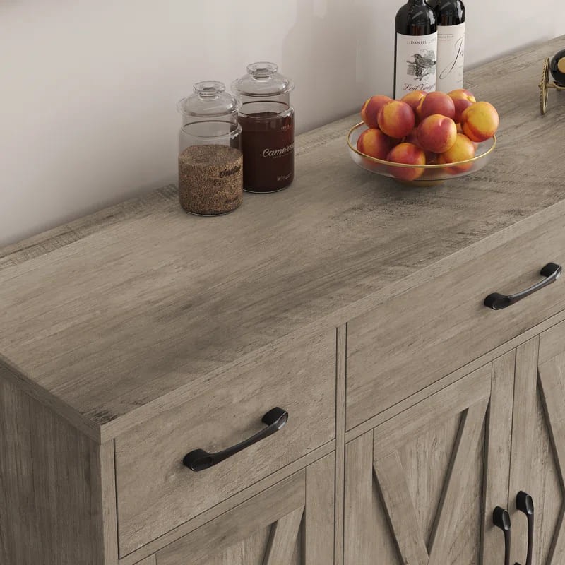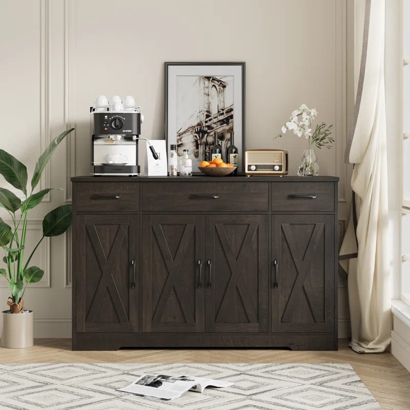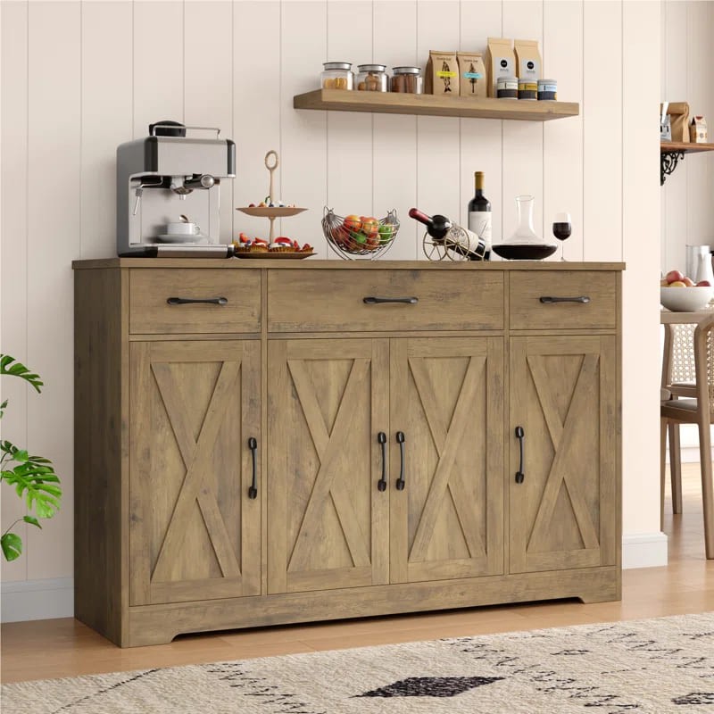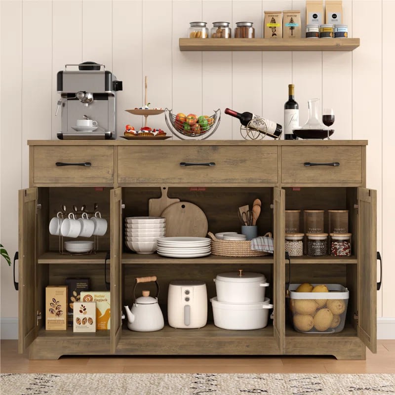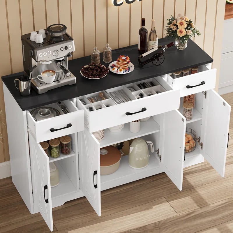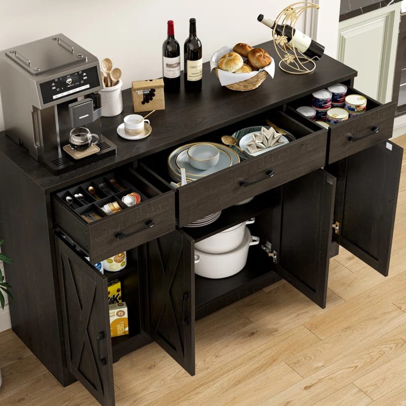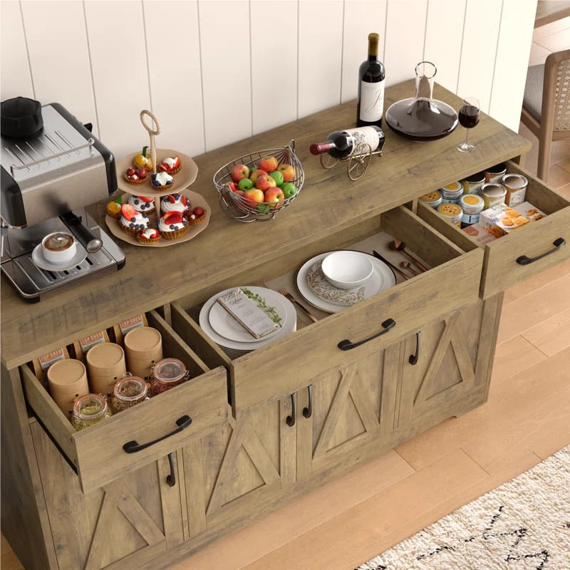 ركن قهوة بأدراج للتخزين بتصميم عصري، مصنوع من خشب طبيعي، يتميز بمظهر أنيق وتخزين فعال.