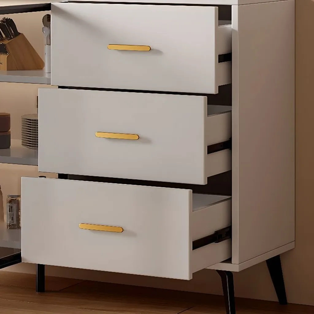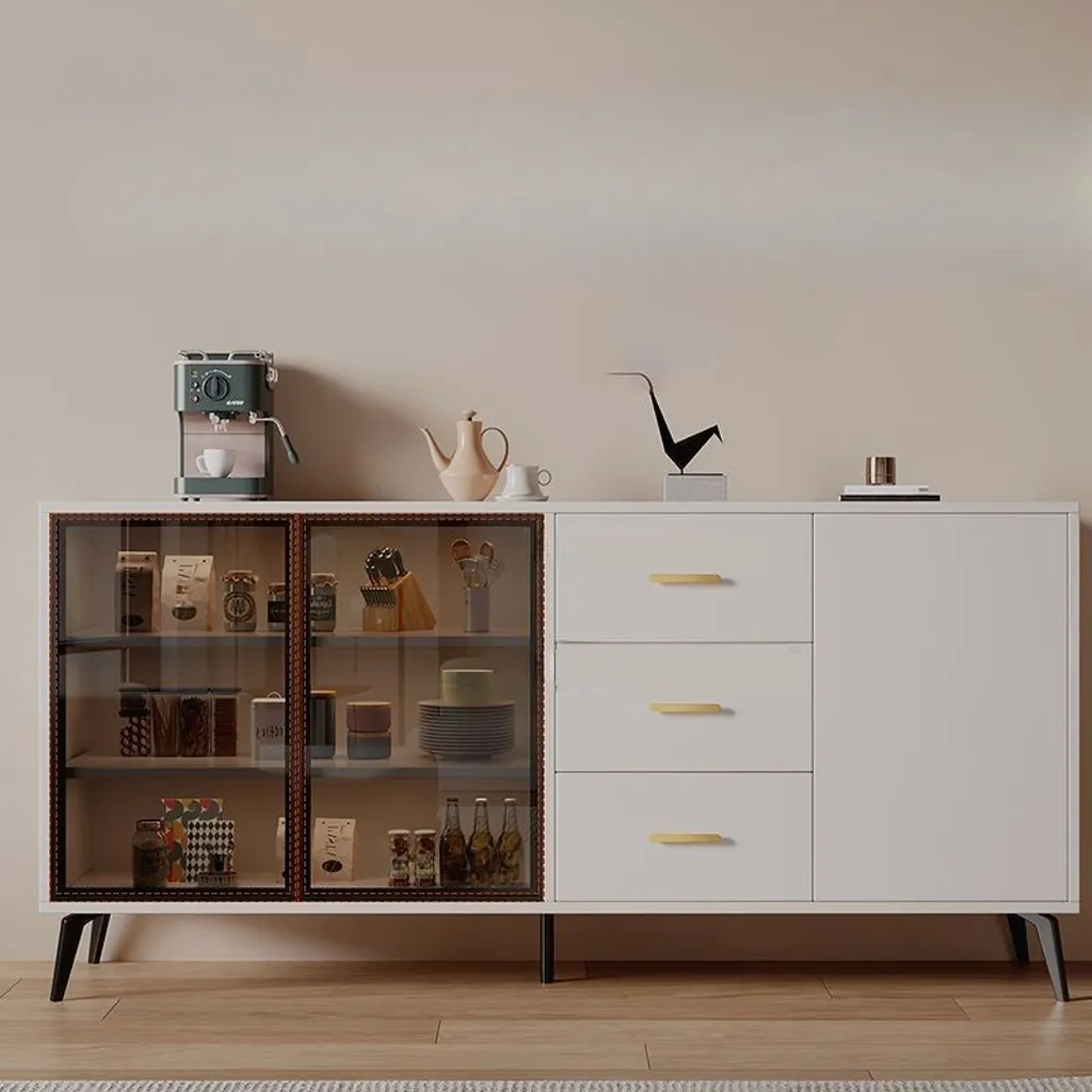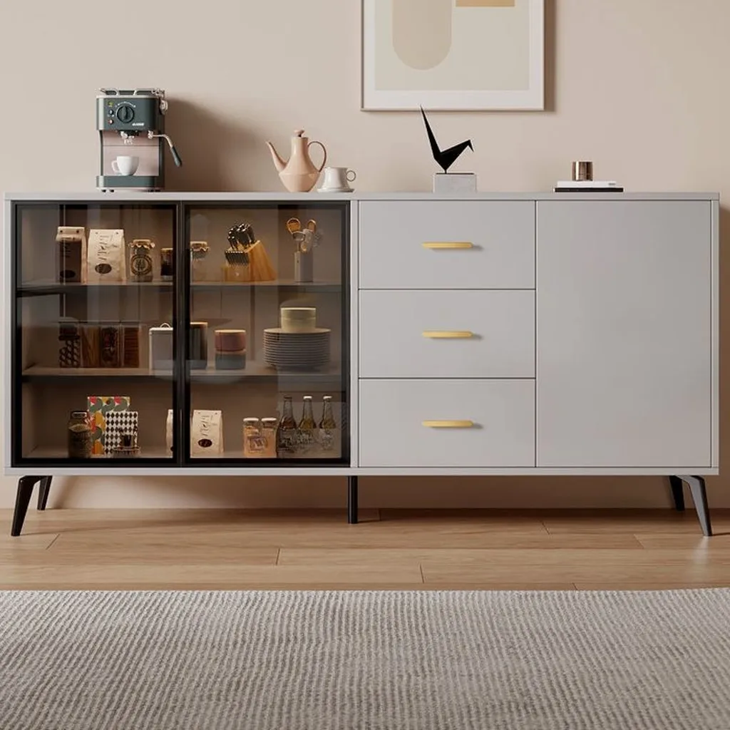 ركن قهوة بأدراج للتخزين بتصميم عصري، مصنوع من خشب طبيعي، يتميز بمظهر أنيق وتخزين فعال.