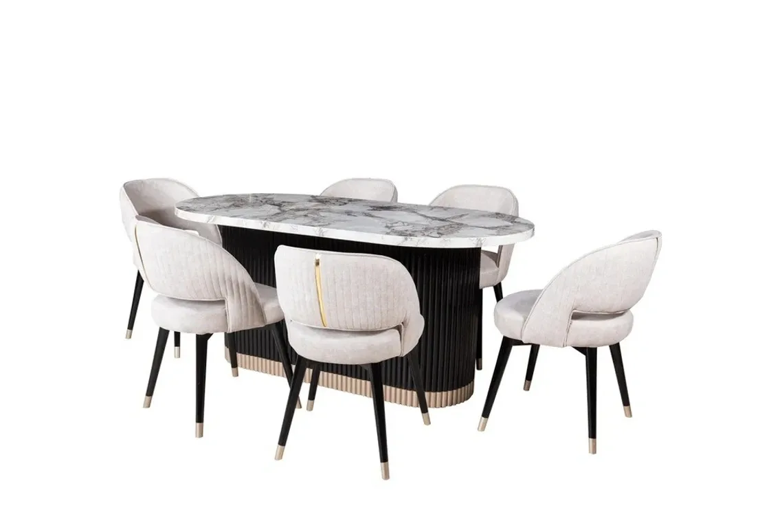 طاولة طعام بسطح رخام وأخشاب طبيعية بتصميم عصري مع كرسي قطيفة مريح بلون بيج وخط ذهبي. مصنوعة من خامات ذات جودة عالية مثل الأخشاب الطبيعية ورخام وقماش قطيفة عالى الجودة.