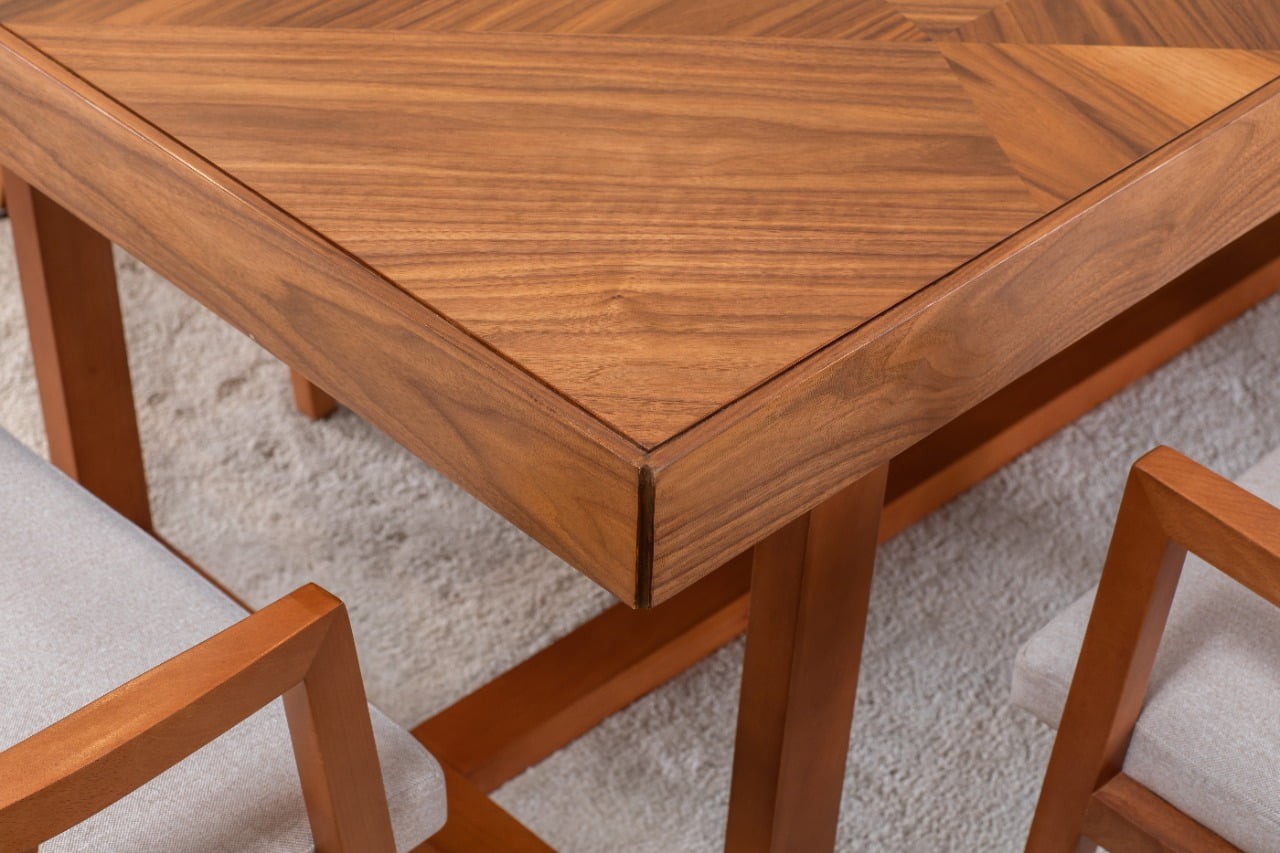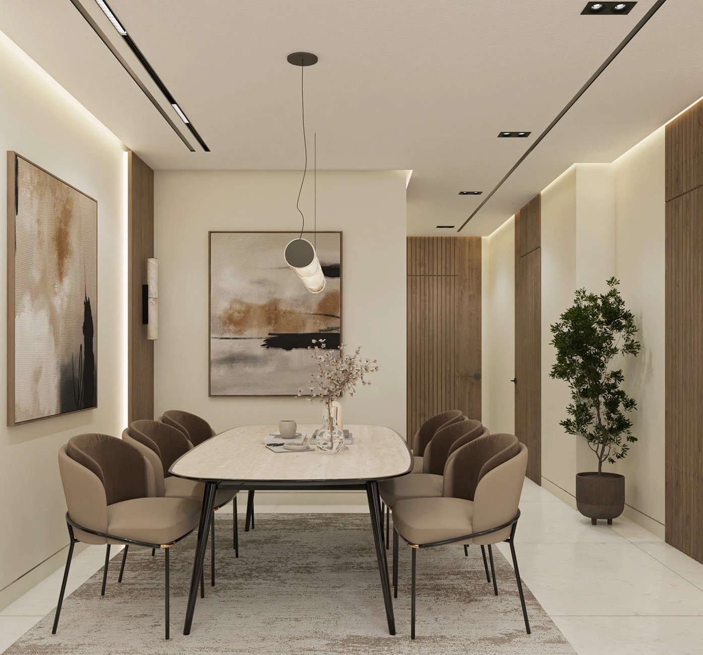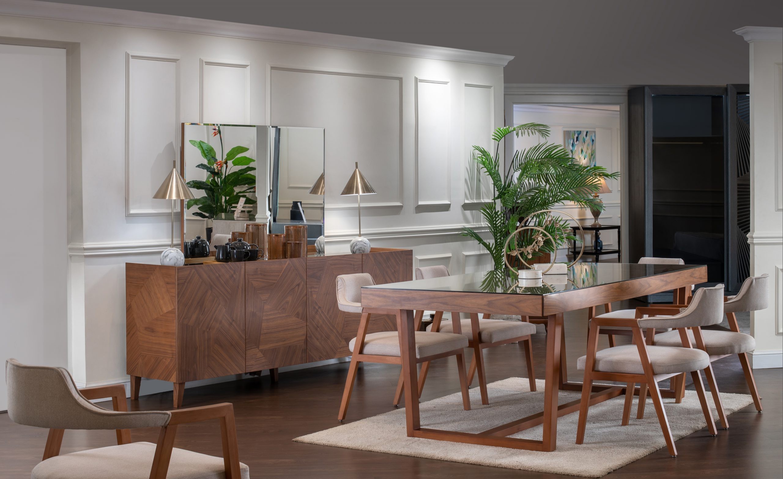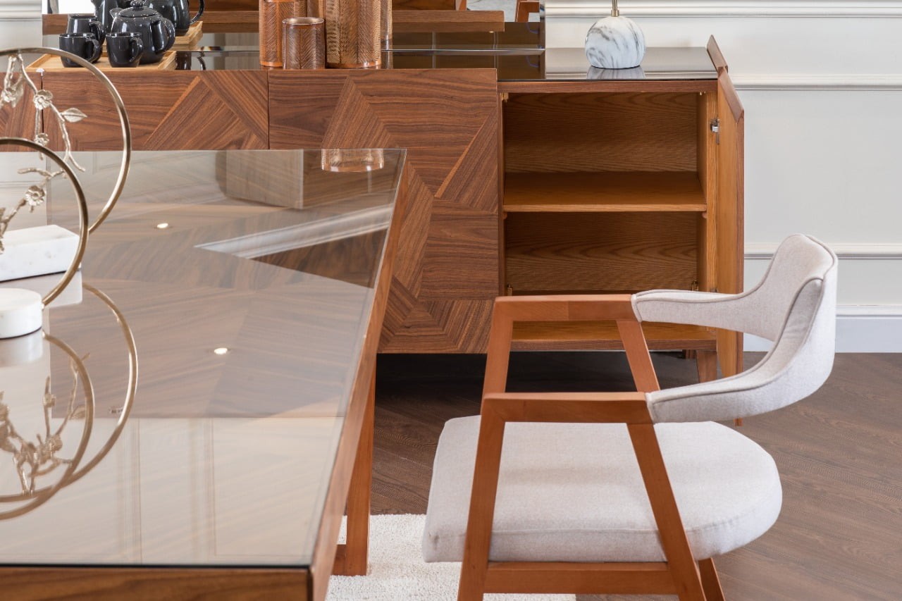 طاولة طعام بسطح زجاج وأخشاب طبيعية بتصميم عصري مع كرسي مريح بلون بني ورمادي. مصنوعة من خامات ذات جودة عالية مما يخلق جوًا عصريًا ومتطورًا في غرفة الطعام.