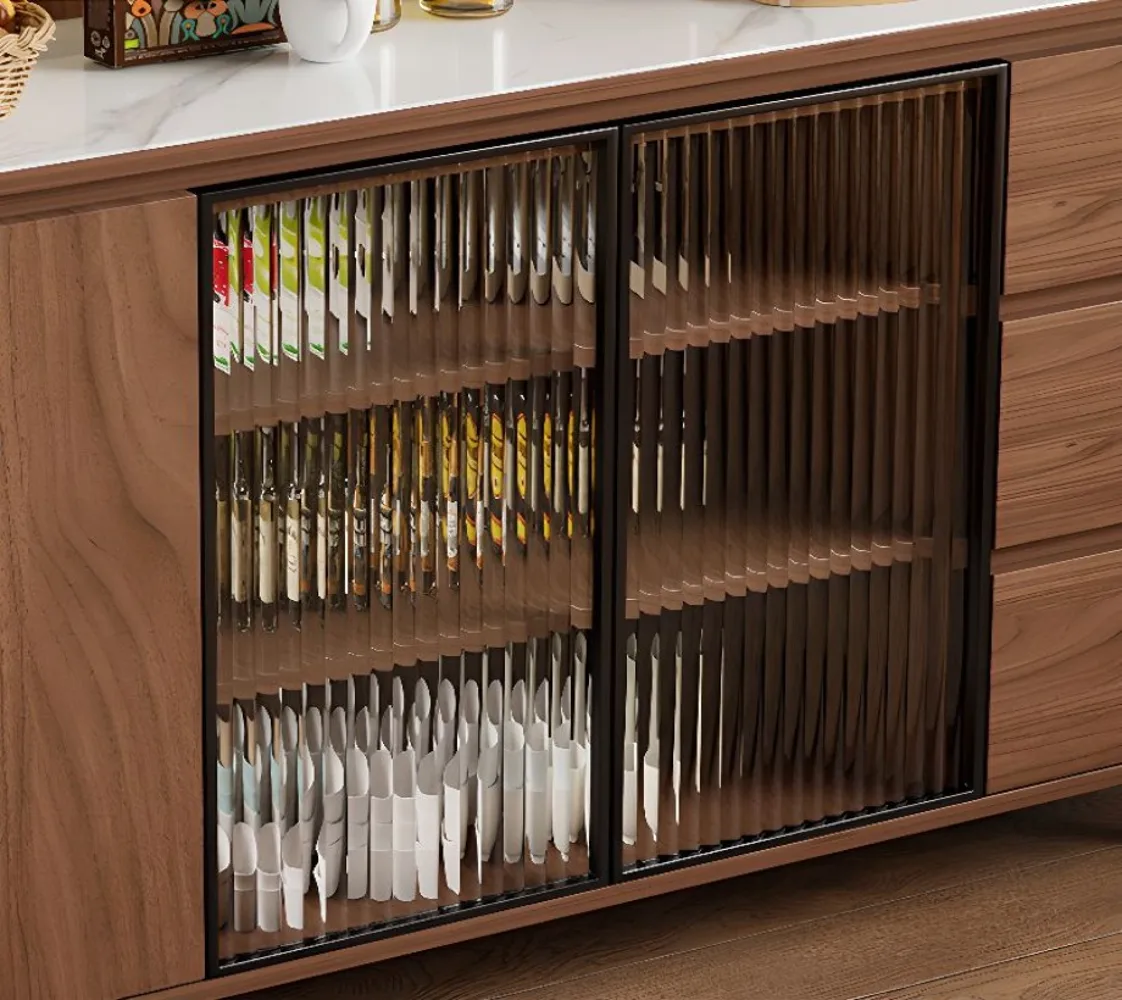 ركن قهوة بأدراج للتخزين بتصميم عصري، مصنوع من خشب طبيعي، يتميز بمظهر أنيق وتخزين فعال.