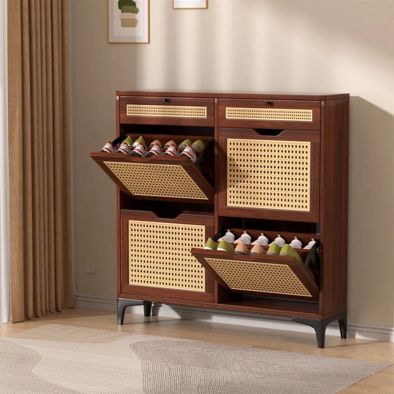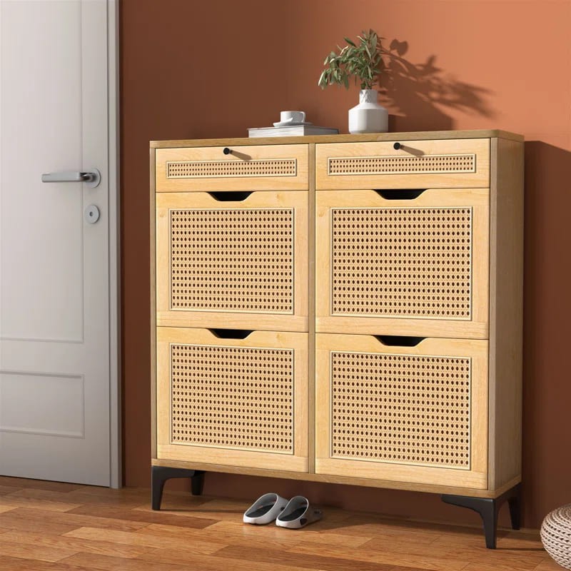 خزانة أحذية حديثة من خشب الروطان مع أدراج قابلة للطي وظهر مغلق ودعم ذاتي
