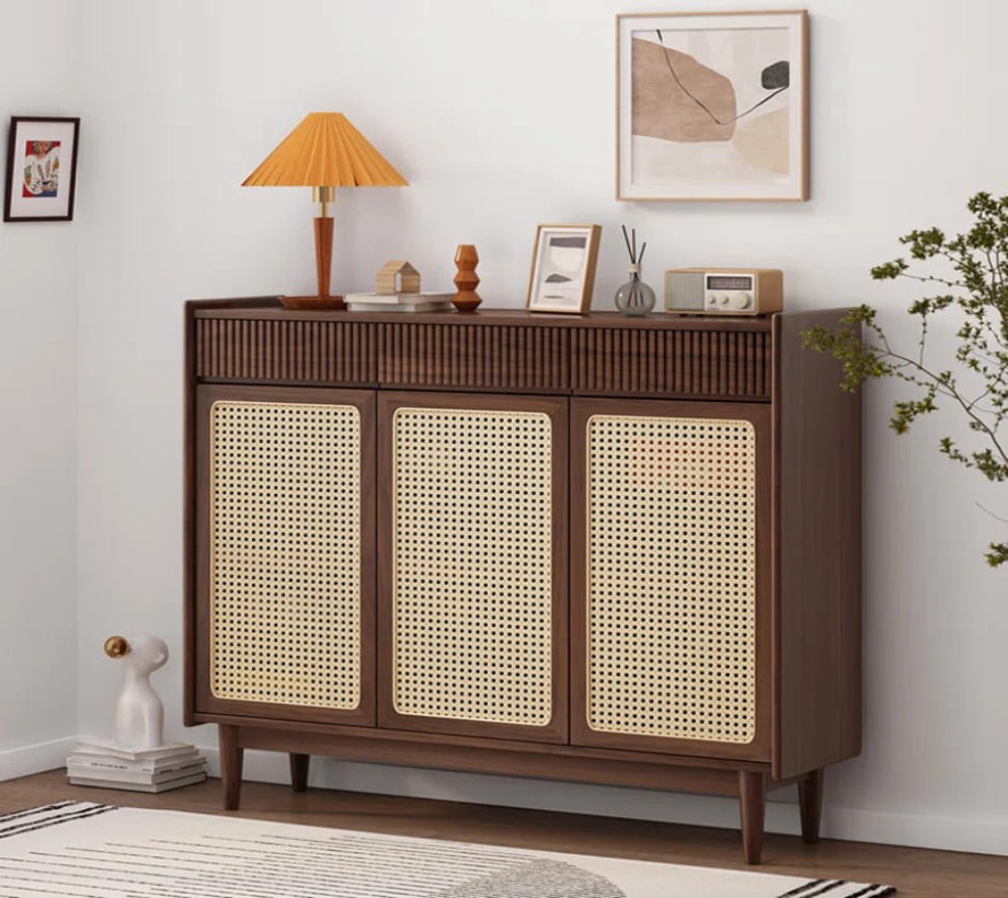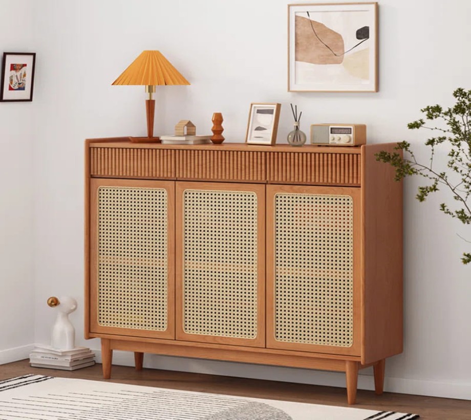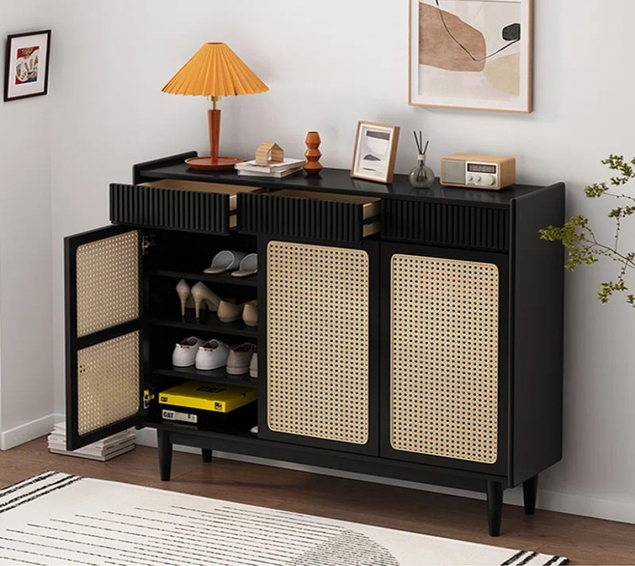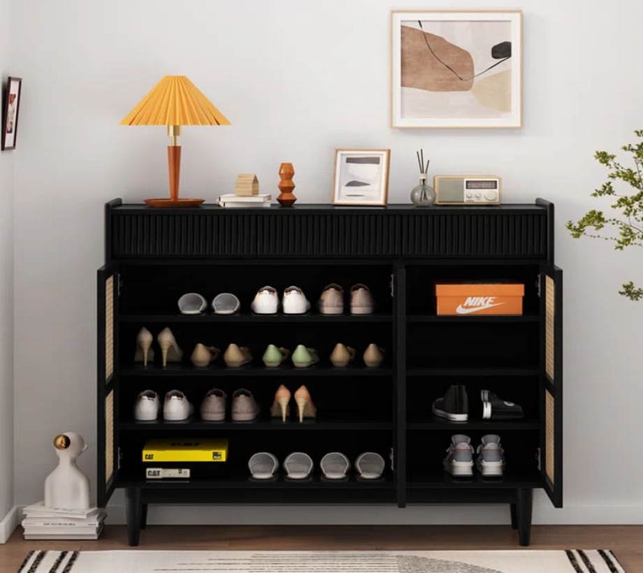 خزانة أحذية حديثة من خشب الروطان مع أدراج وأرفف قابلة للتعديل وبوابة وظهر مغلق ودعم ذاتي