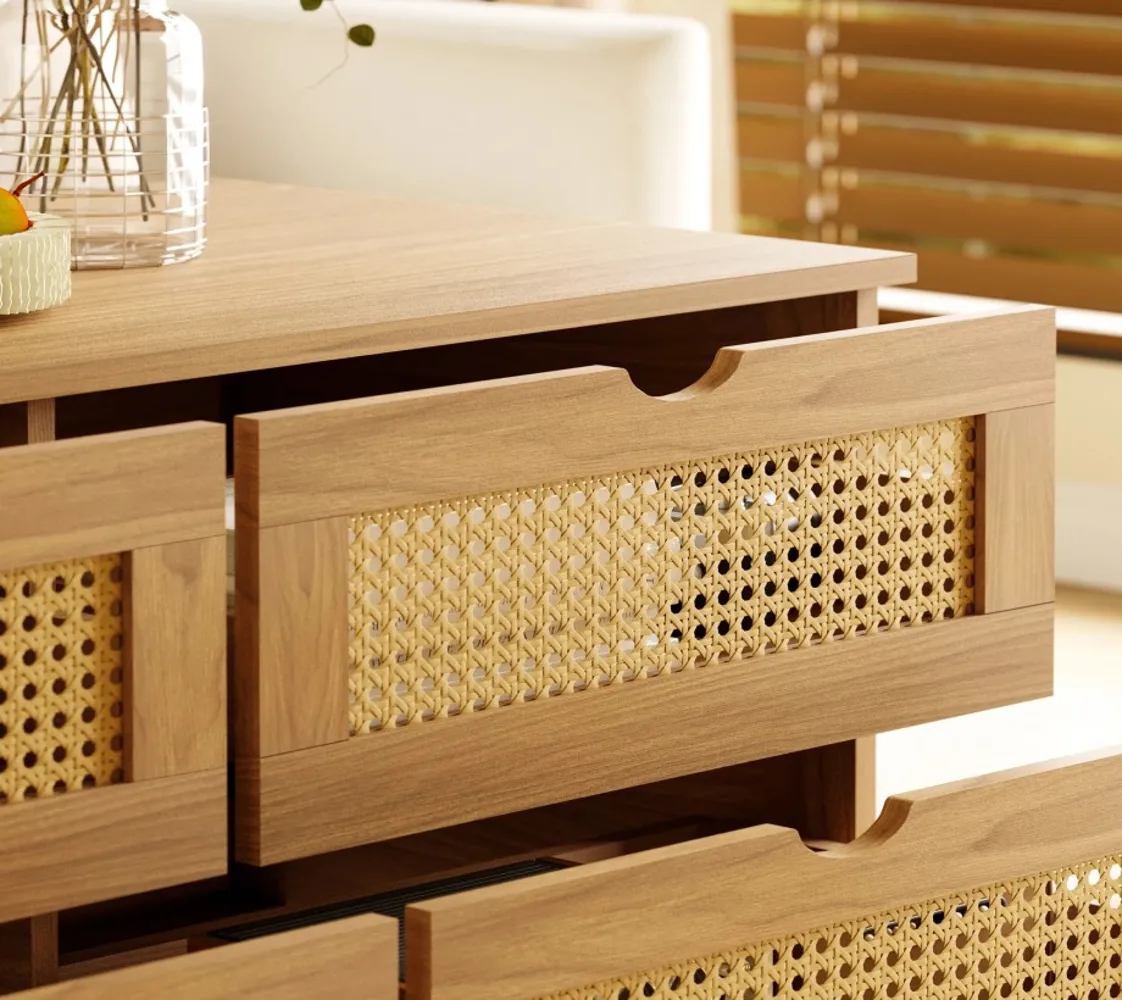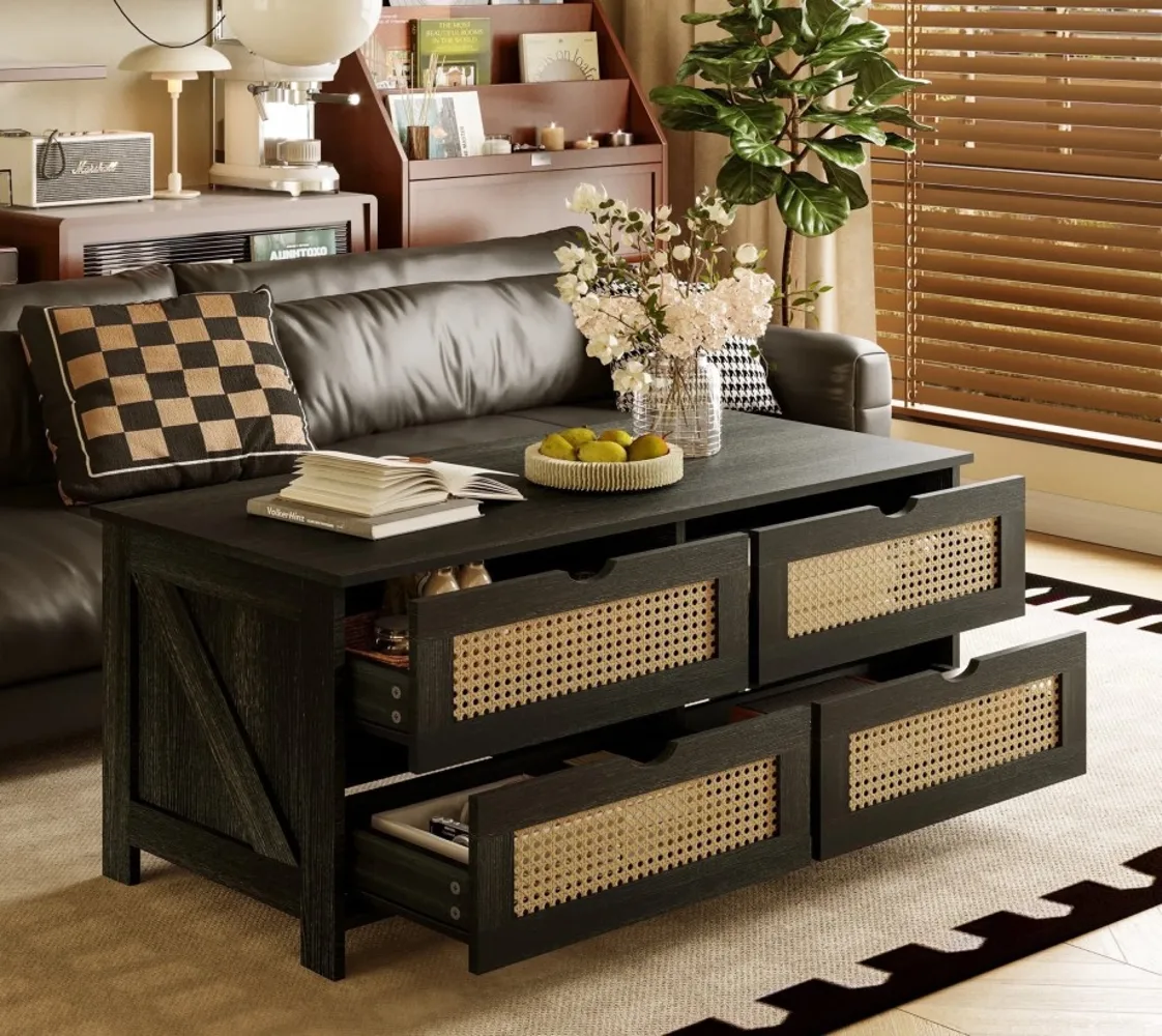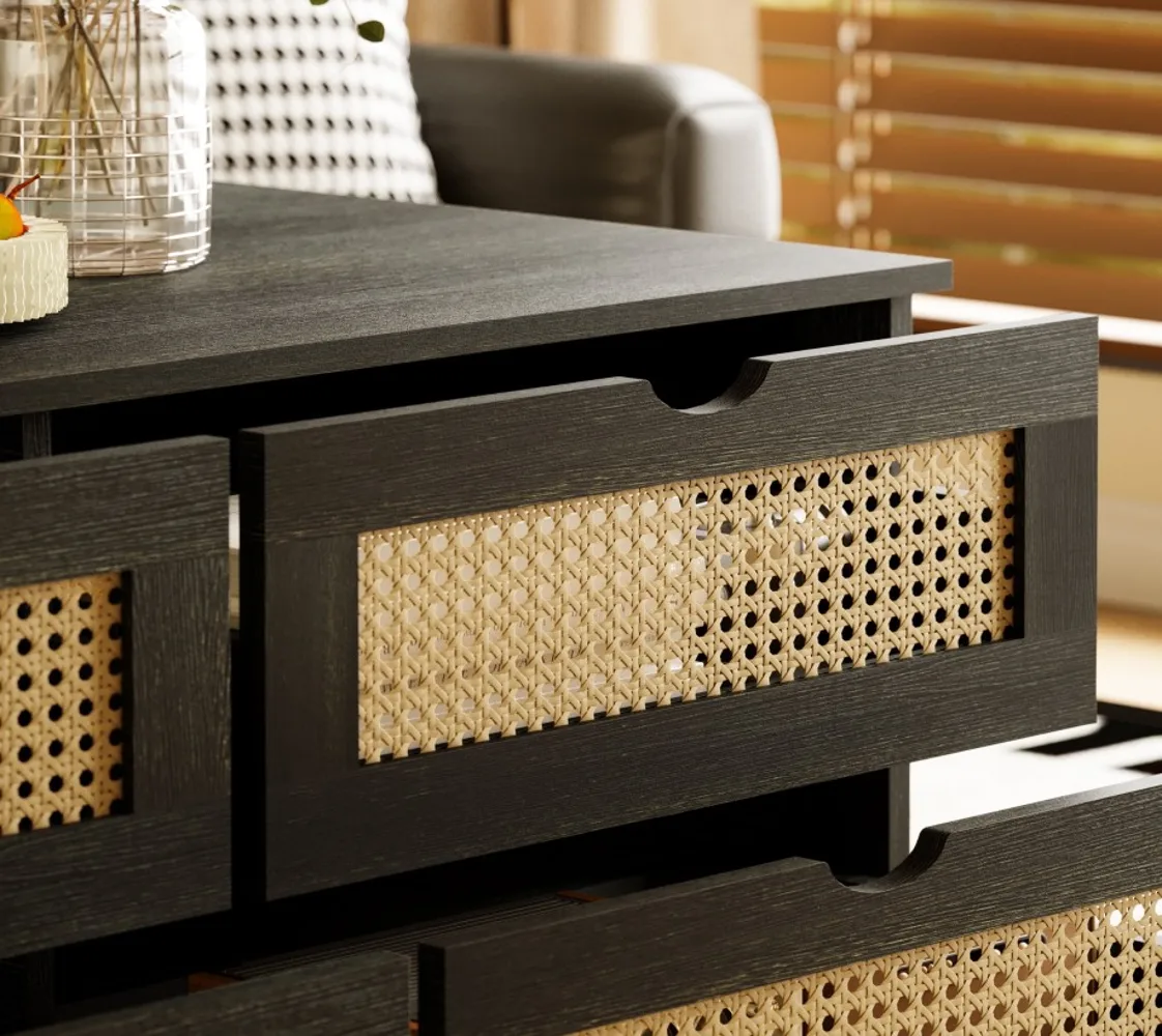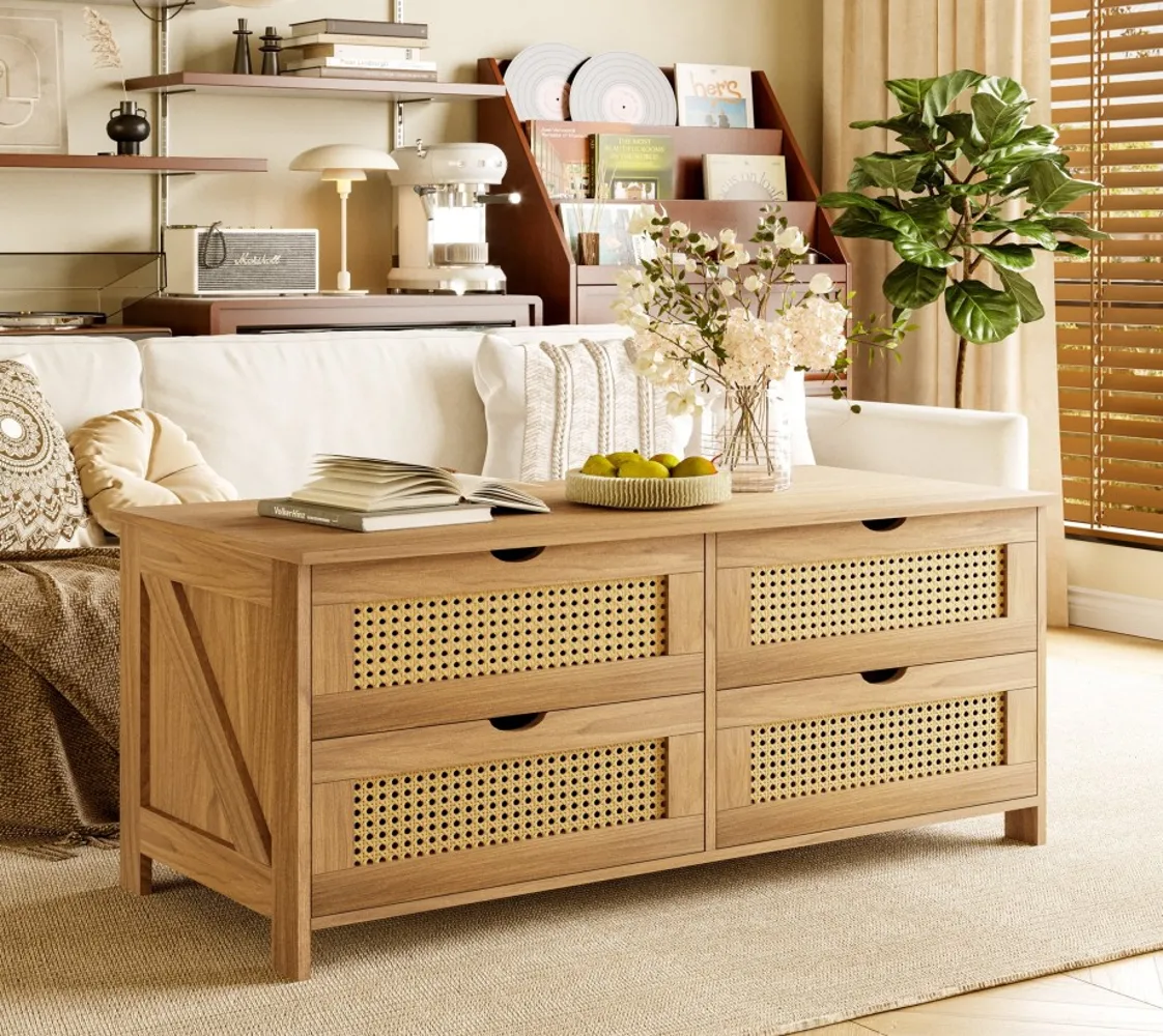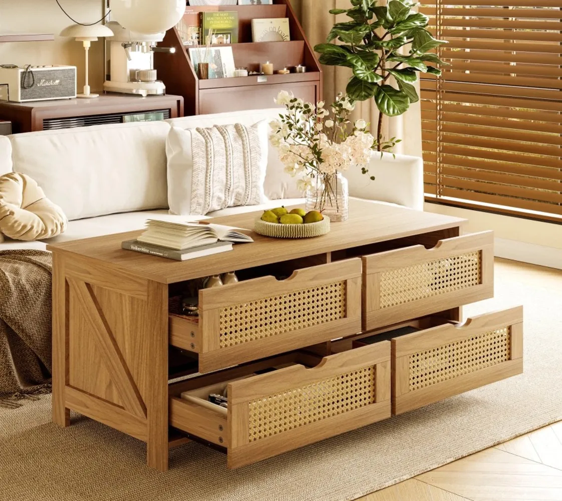 طاولة قهوة مودرن بتصميم أنيق بأدراج لمساحة تخزين مميزة مصنوعة من الروطان. تتميز بجودة عالية وتناسب أي مساحة معيشة.