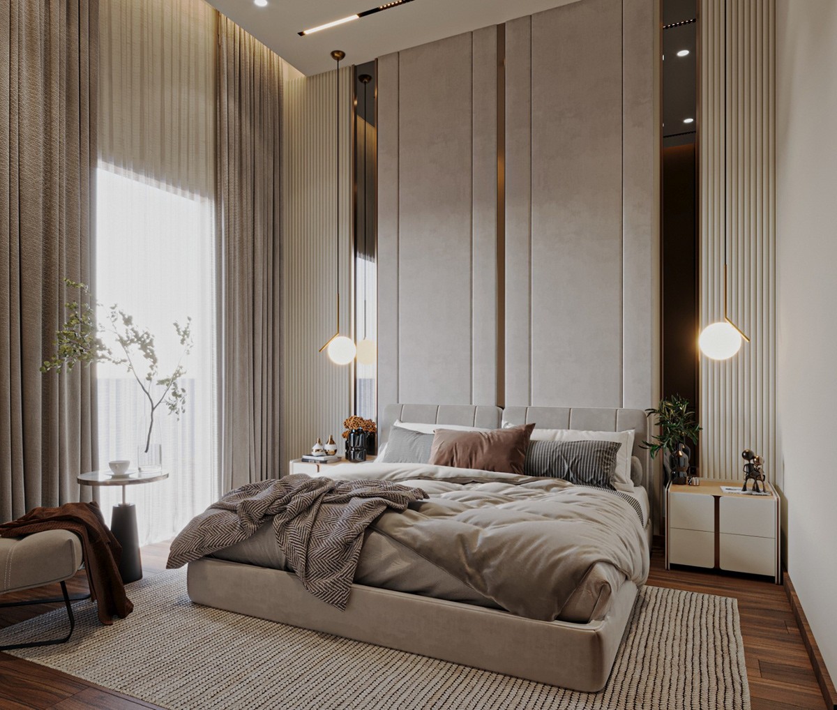 سرير بمسند ظهر بتصميم أنيق، مصنوع من خشب طبيعي زان، مغطى بقماش قطيفة، يجمع بين الأناقة والراحة بأبعاد مثالية ومتناسبة من الخشب عالى الجودة مع 2 كومود.
