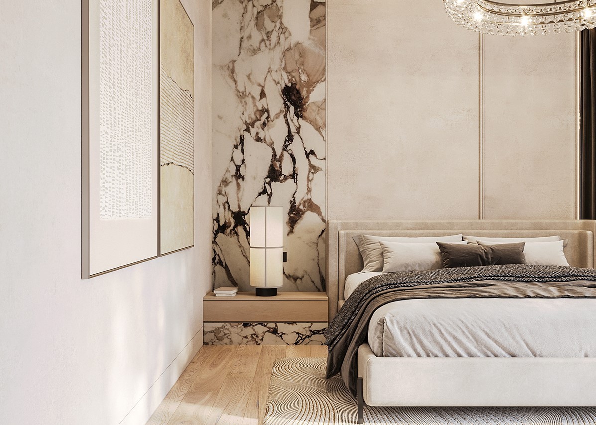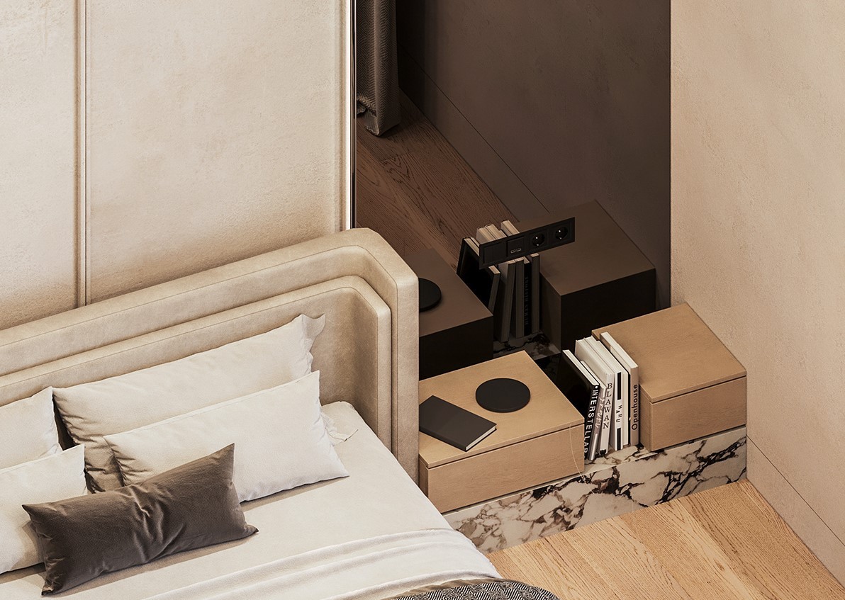 الكومودين بجانب السرير يتميزان بتصميم بسيط وأنيق، مصنوعين من الخشب الفاتح مع جزء مغطى بالرُخام الأبيض المزين بخطوط رمادية ناعمة. يحتوي كل كومود على درج واحد بواجهة نظيفة بدون مقابض بارزة، مما ينسجم مع التصميم الحديث. أبعاد الكومودين الصغيرة تجعلها مثالية للاستخدام في المساحات العصرية مع الحفاظ على المظهر الجمالي.