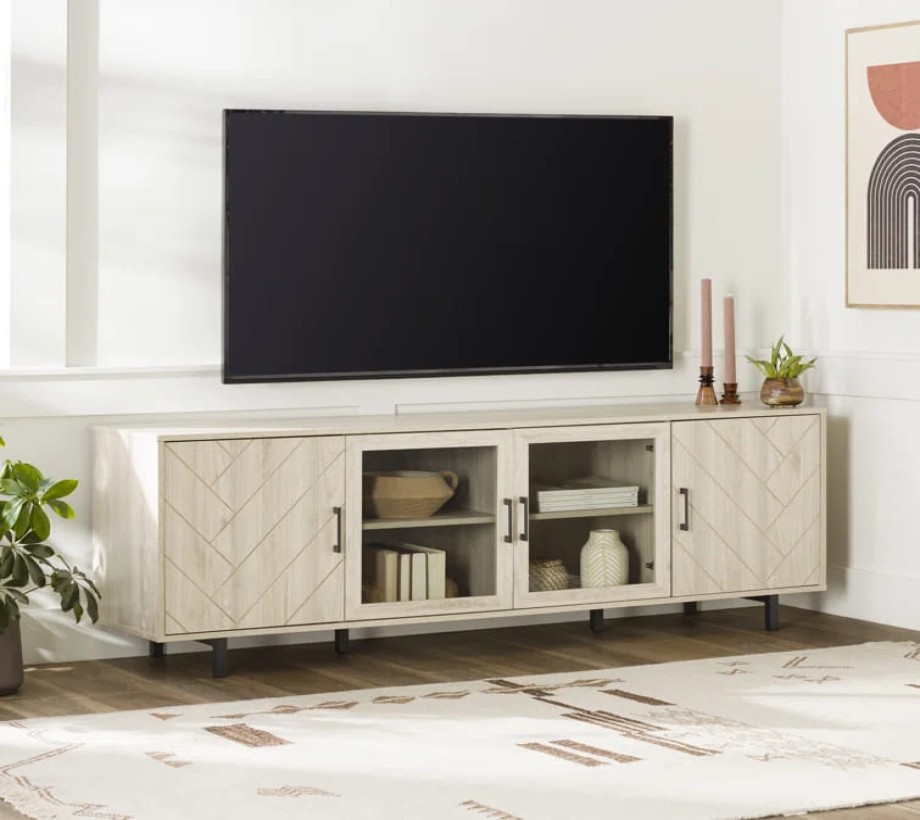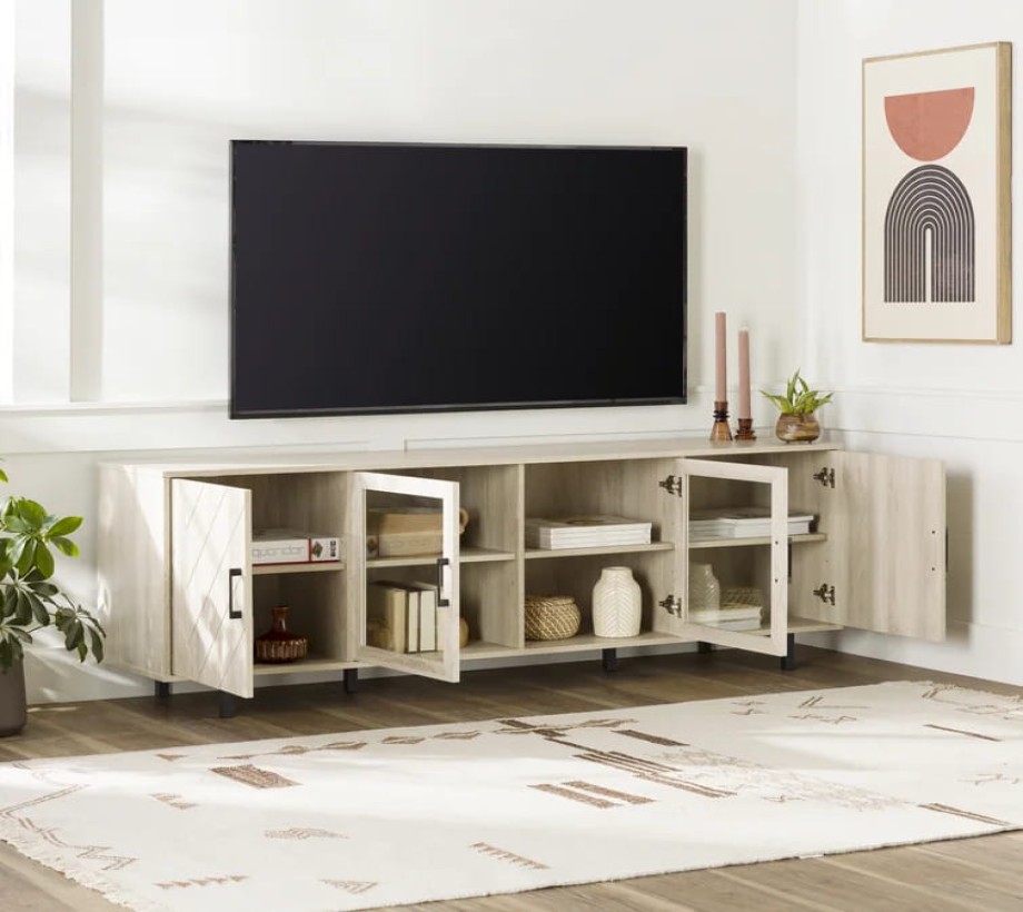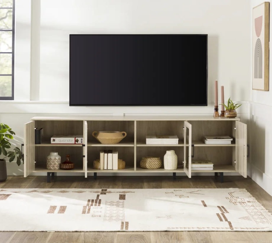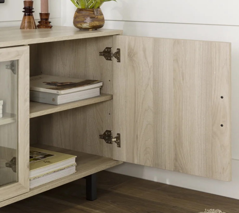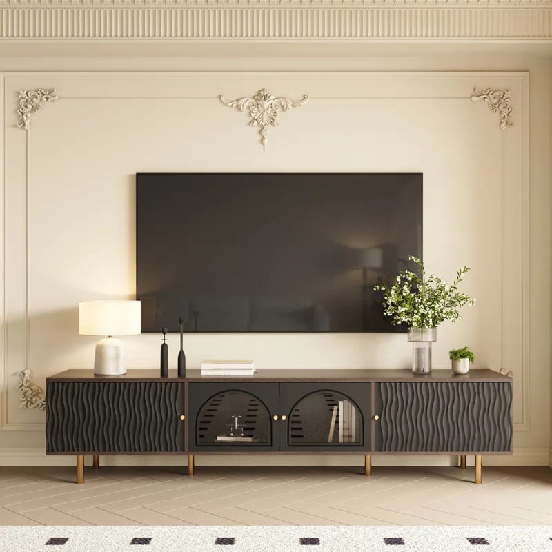 وحدة تلفاز أنيقة مصنوعة من الخشب بلون بني داكن او بيج فاتح. تحتوي على أربعة أبواب؛ اثنان في الوسط مزوّدان بزجاج شفاف لإبراز المحتويات الداخلية، بينما الأبواب الجانبية تأتي بنمط متعرج يضيف لمسة جمالية. الأرجل معدنية باللون الأسود لإضفاء مظهر عصري ودعم الثبات. أبعاد الوحدة: 180 سم عرض × 40 سم عمق × 60 سم ارتفاع.