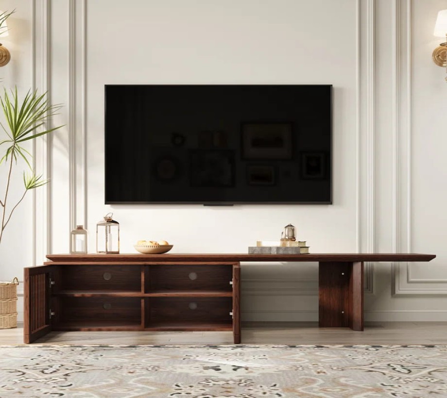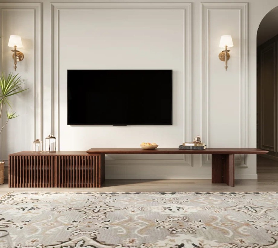 وحدة تلفاز عصرية مصنوعة من الخشب بلون بني داكن، تتميز بتصميم عملي وأنيق. تتكون الوحدة من جزئين رئيسيين: الجزء الأيسر عبارة عن خزانة بأبواب ذات تصميم شبكي عمودي، مما يوفر مساحات تخزين عملية وأنيقة للأجهزة والملحقات. أما الجزء الأيمن فيتضمن سطحًا مستويًا مثاليًا لوضع الأجهزة الإلكترونية مثل التلفاز وأجهزة الصوت. الأبعاد: 200 سم عرض × 40 سم عمق × 40 سم ارتفاع، مع إمكانية تمديد الوحدة.