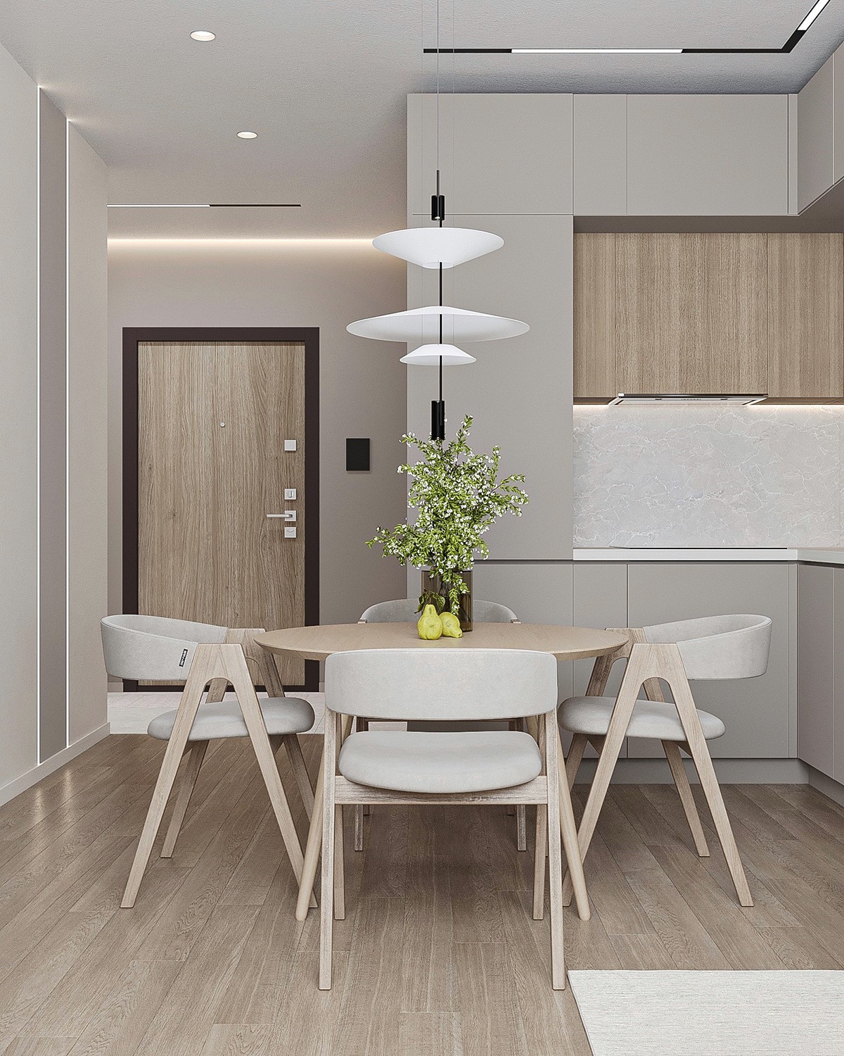 طاولة طعام دائرية مصنوعة من الخشب الطبيعي بلون خشبي فاتح، بقطر 120 سم وارتفاع 75 سم، مما يجعلها مثالية للمساحات العائلية. تضم الطاولة أربعة كراسي مصنوعة من نفس نوع الخشب، مع مساند ظهر ومقاعد مبطنة بالقماش البيج الفاتح لراحة إضافية. ارتفاع الكرسي حوالي 80 سم، مع عرض 50 سم وارتفاع المقعد عن الأرض حوالي 45 سم. تتميز أرجل الكراسي بتصميم مائل قليلاً للخارج لتعزيز الثبات. تصميم هذه المجموعة يجمع بين البساطة والحداثة، مما يجعلها إضافة مثالية لأي منزل.