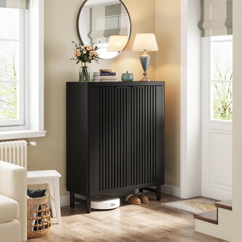 خزانة أحذية أنيقة مصنوعة من الخشب، تتوفر بألوان الأسود، الأبيض، البني الفاتح والبني الداكن، مع تصميم عصري يميزها بخطوط رأسية على الأبواب. الأبواب مزودة بمقابض معدنية صغيرة تضفي مظهرًا أنيقًا وتتيح سهولة الاستخدام. الأرجل القصيرة توفر ثباتًا للخزانة وتترك مساحة صغيرة أسفلها. الخزانة توفر مساحة كبيرة لتخزين الأحذية بطريقة منظمة ومرتبة، مما يجعلها خيارًا مثاليًا للمنازل الحديثة التي تبحث عن حلول تخزين عملية وأنيقة. الأبعاد التقريبية للخزانة هي: العرض 85 سم، الارتفاع 110 سم، والعمق 35 سم. تصميمها العصري والمتعدد الألوان يجعلها تتناسب مع مختلف الديكورات الداخلية.