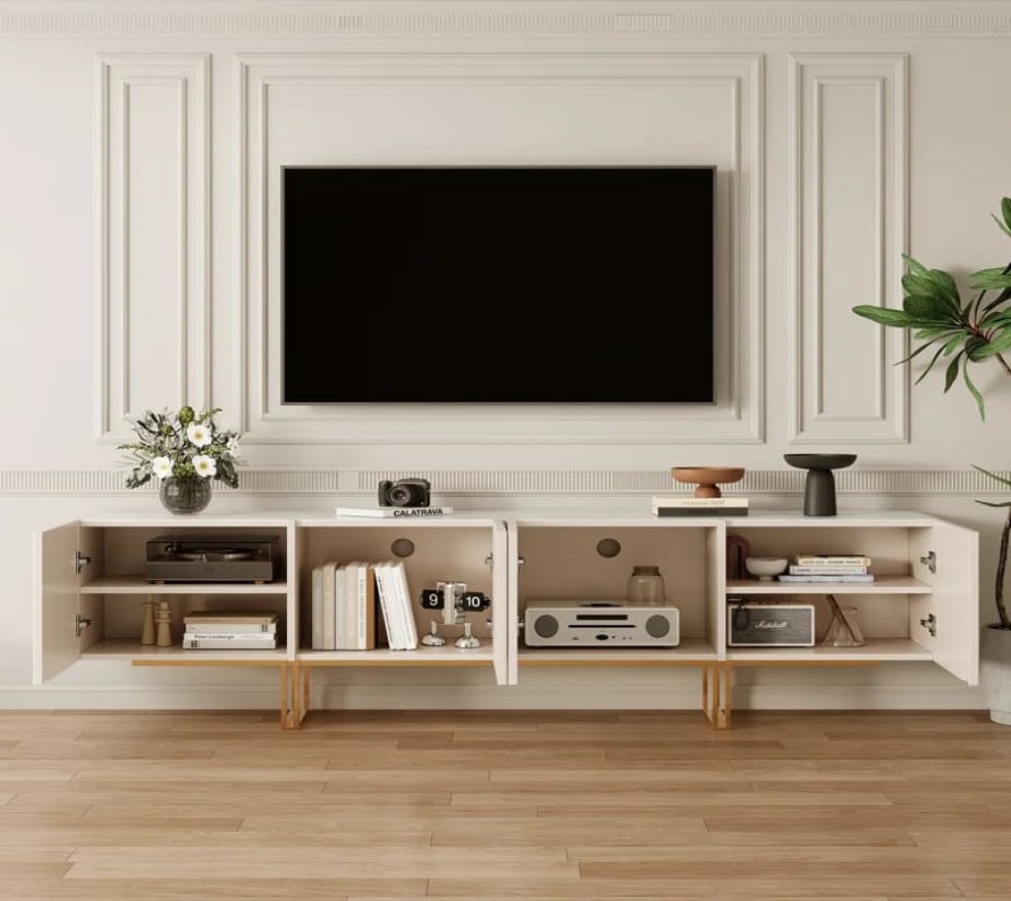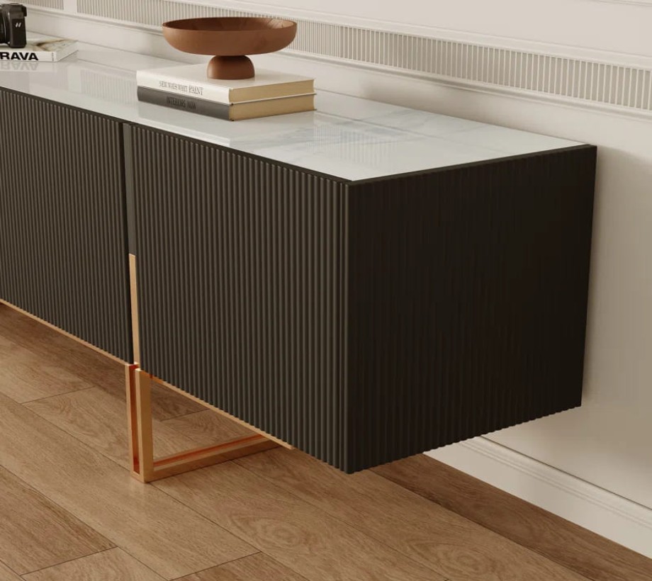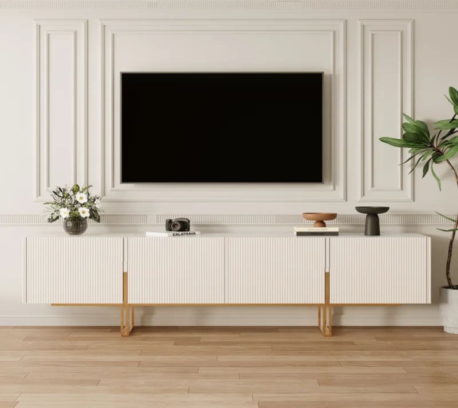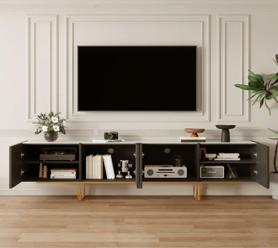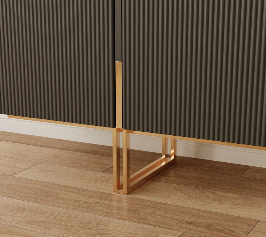 ترابيزة تلفاز عصرية بأبعاد 180 سم طول × 40 سم عرض × 60 سم ارتفاع. مصنوعة من الخشب عالي الجودة باللون الأسود أو الأبيض مع خطوط رأسية على الأبواب تضيف لمسة فريدة. تتميز بأرجل معدنية ذهبية تُبرز التصميم العصري وتوفر ثباتاً قوياً. تحتوي على وحدات تخزين بأربع أبواب مغلقة، مما يجعلها مثالية لتنظيم المساحة. تصميمها يجمع بين الأناقة والوظيفة ليناسب المساحات الحديثة.