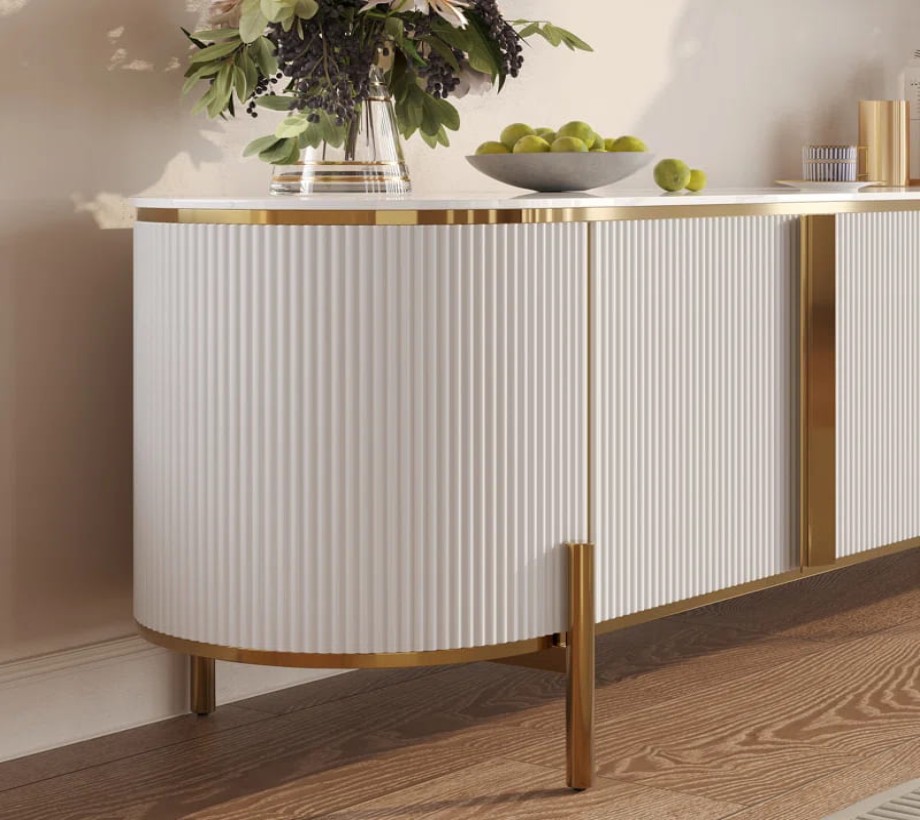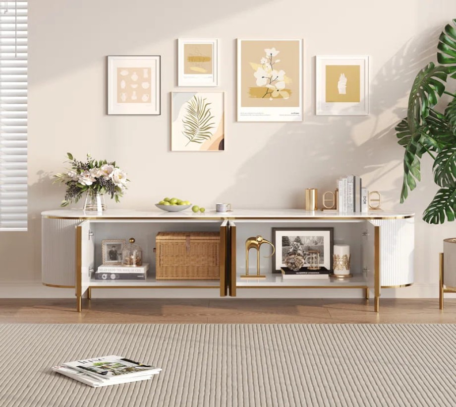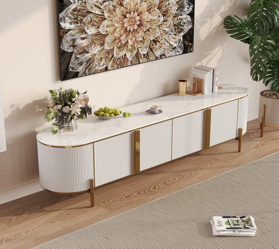 ترابيزة تلفاز خشبية أنيقة باللون الأبيض مع لمسات ذهبية وتصميم عصري