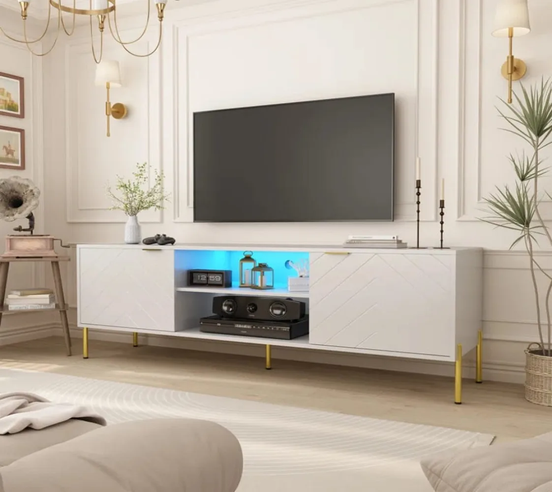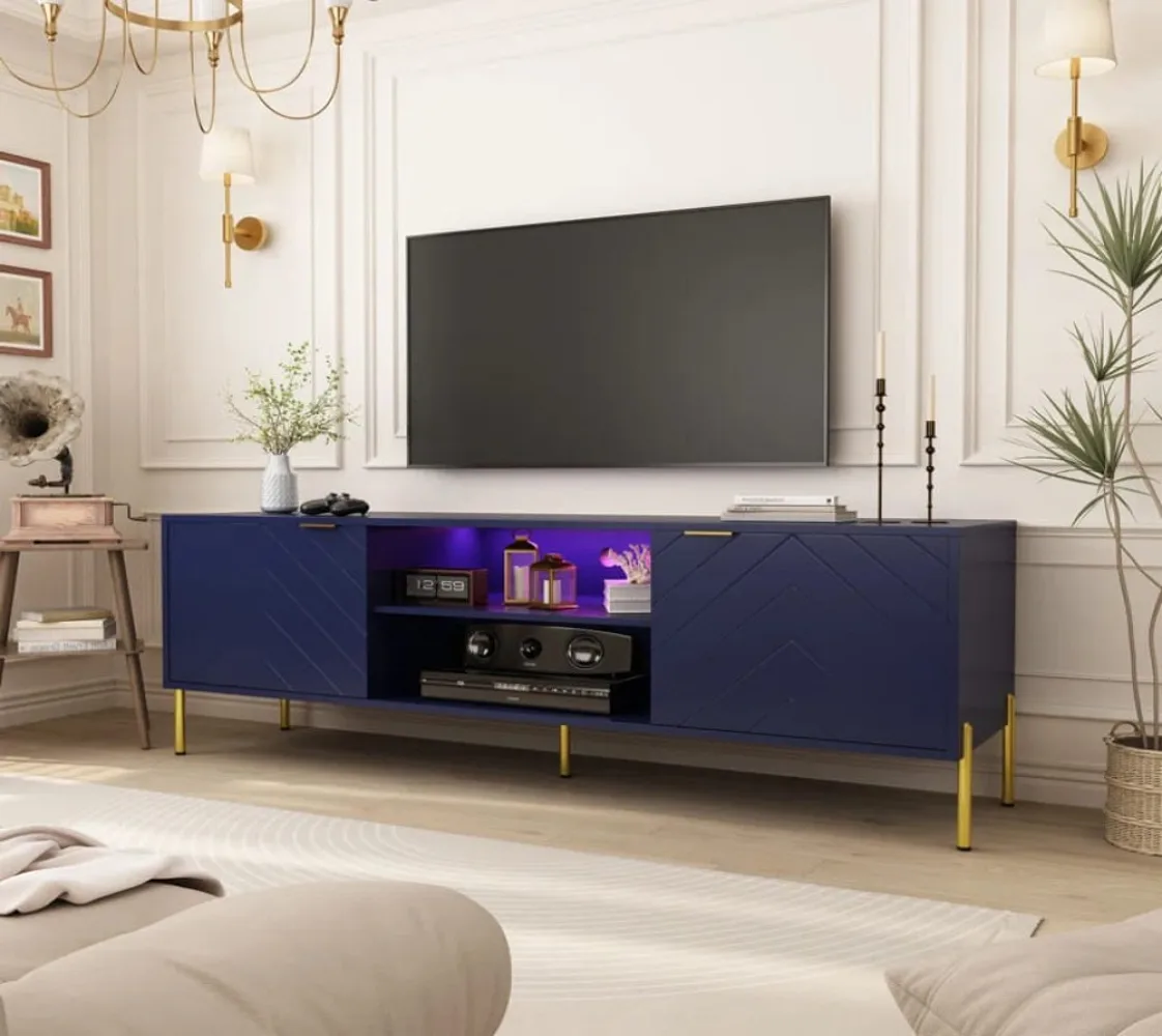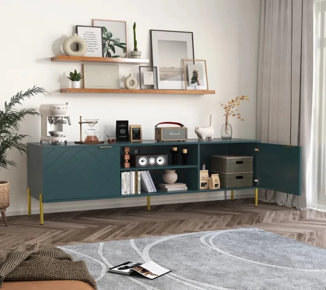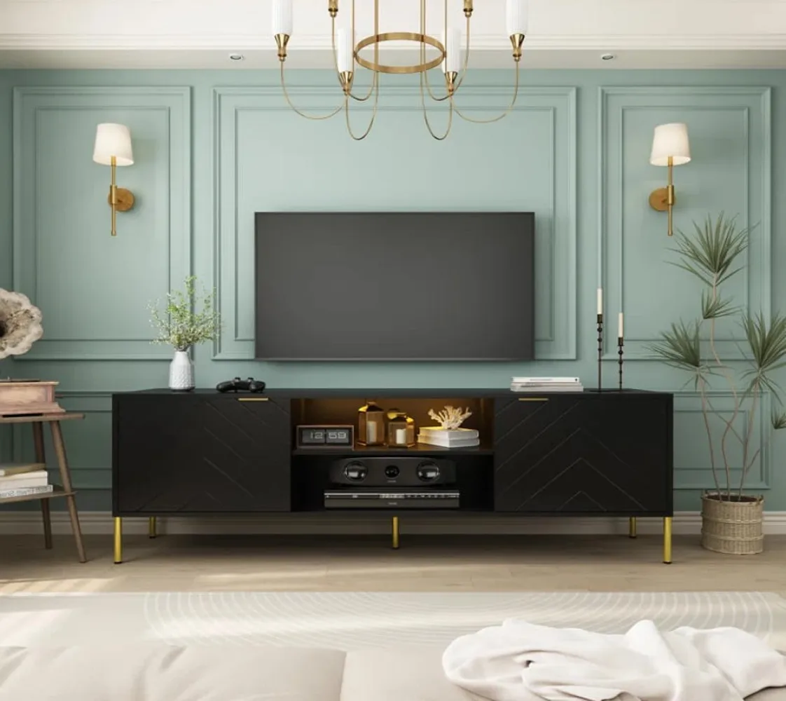 ترابيزة تلفاز أنيقة بأبعاد 150 سم طول × 40 سم عرض × 50 سم ارتفاع، مصممة لتناسب المساحات العصرية بكل أناقة. مصنوعة من الخشب المصقول عالي الجودة بألوان متعددة: الأسود، الأبيض، الأزرق الداكن، والأخضر، مما يضيف لمسة من التجدد والتنوع. تتميز الأرجل المعدنية باللون الذهبي، مما يمنحها لمسة من الفخامة والترف. تحتوي على جزئين مغلقين بأبواب على الجانبين، بالإضافة إلى جزء مفتوح في المنتصف مزود برفوف لتوفير مساحة تخزين عملية لأجهزة التلفاز والملحقات. التصميم المتناغم يجمع بين الأناقة والوظيفة، مما يجعلها خيارًا مثاليًا للديكورات العصرية والحديثة.