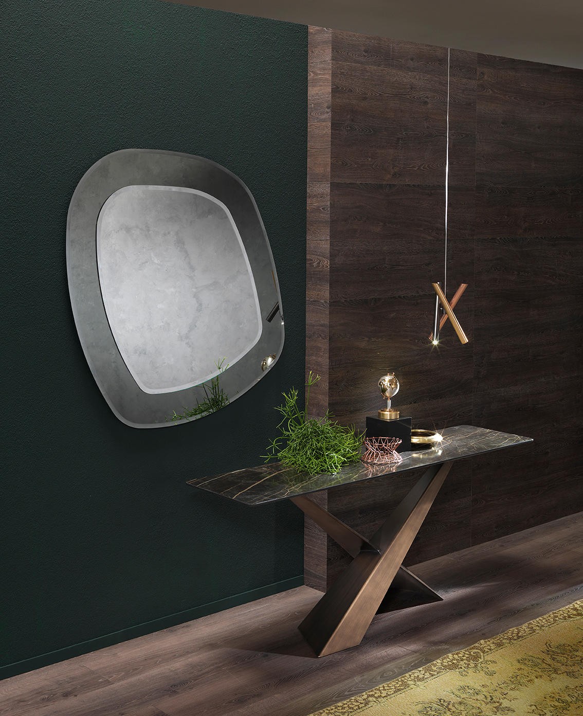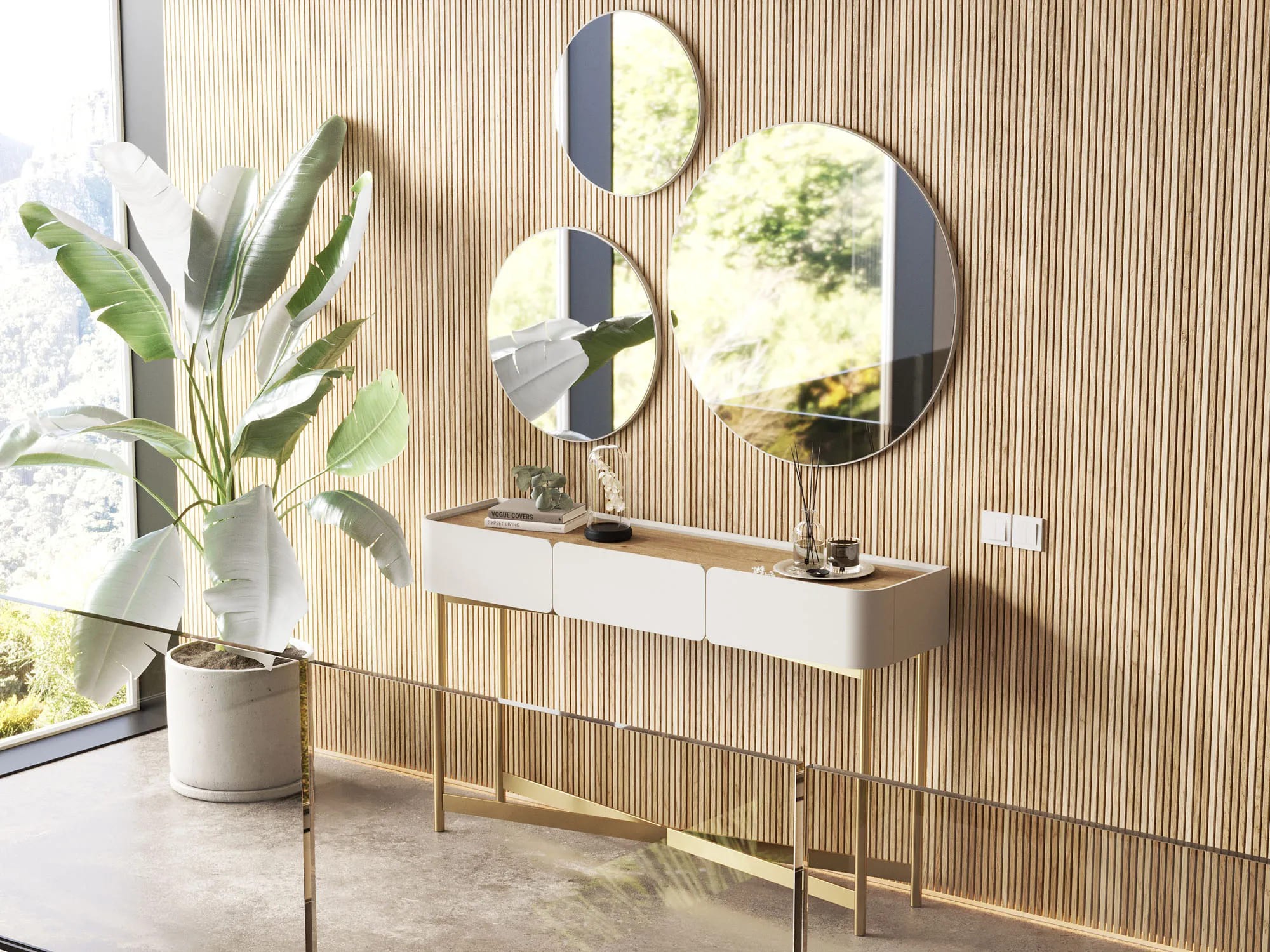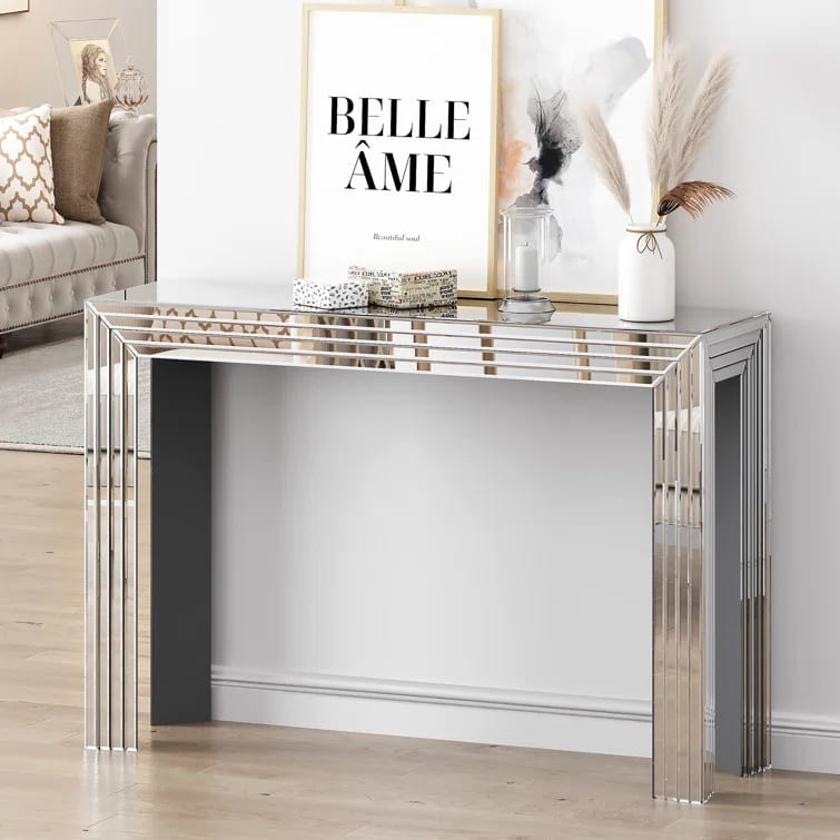 الكونسول المصنوع من الخشب المغلف بزجاج المرايا يتميز بمظهر فخم وعصري، مما يجعله إضافة مثالية للديكورات الحديثة. يتمتع بسطح عاكس من الزجاج المرايا الذي يعزز الإحساس بالمساحة ويزيد من سطوع الضوء، مما يضفي عليه لمسة من الأناقة والبساطة. تصميمه يعتمد على الخطوط المستقيمة والزوايا الحادة التي تضفي تناغمًا ورقيًا على الكونسول، مما يجعله خيارًا مثاليًا للمساحات العصرية.